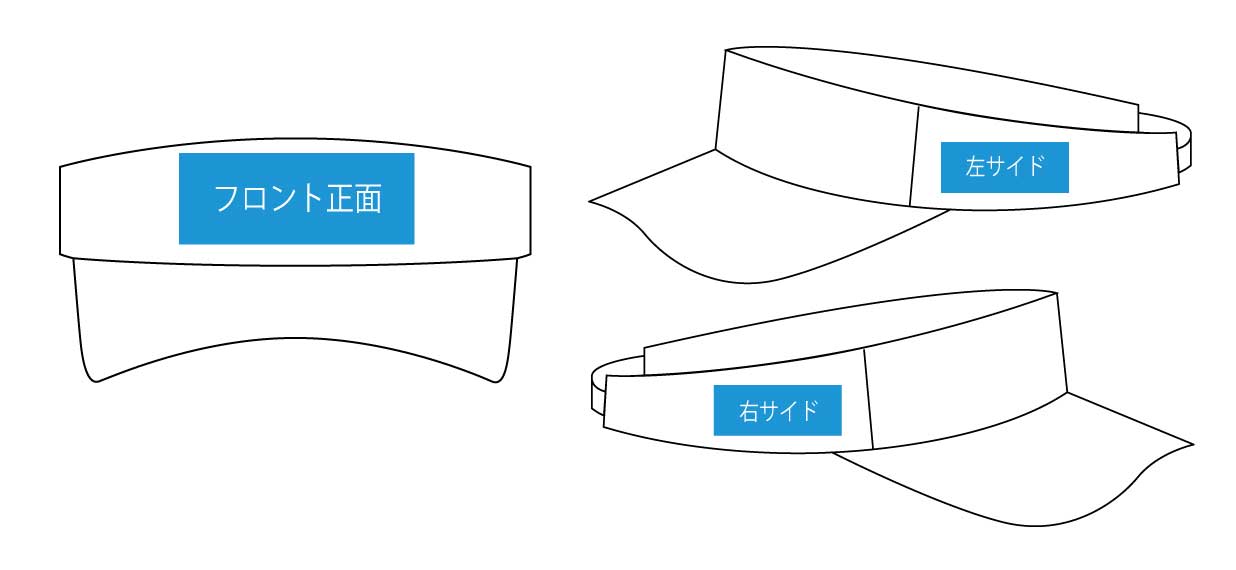 スポーティーなデザインが人気のファンクションバイザー。こちらはフロント部の刺繍範囲はバイザーとしては大きめですが、サイドへの刺繍範囲は狭く、文字1段程度の刺繍のみご対応が可能になります。