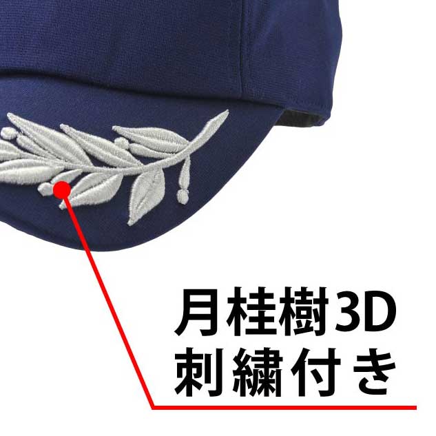 庇の月桂樹刺繍が盛り上げ刺繍になったインパクトの強いアイテム。刺繍の中にウレタンを入れて盛り上げてます。刺繍は盛り上げると立体的になり迫力がでる半面、丸みを帯びてシャープな印象が損なわます。また、洗濯での耐久性も多少落ちます。インパクト重視のお客様にはお勧めのアイテムです。
