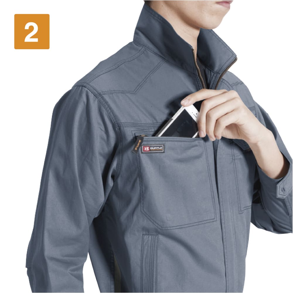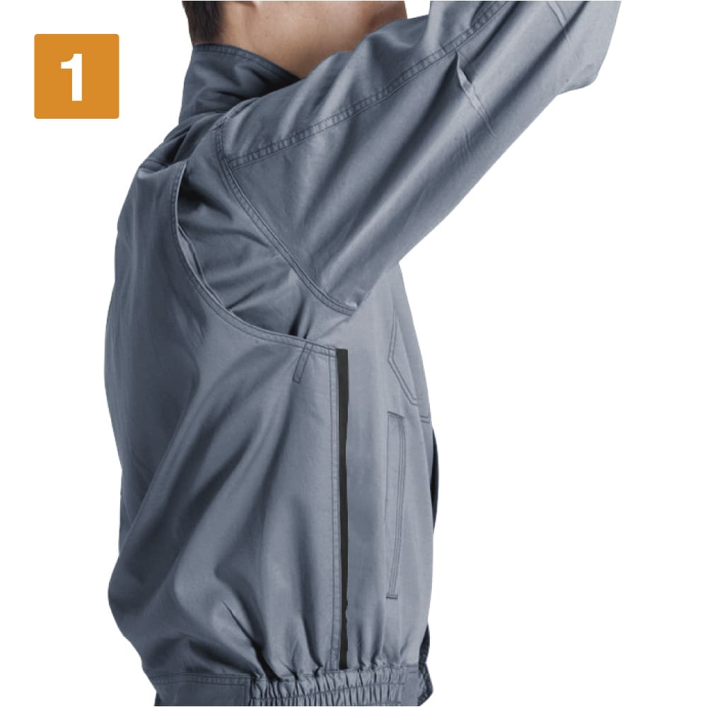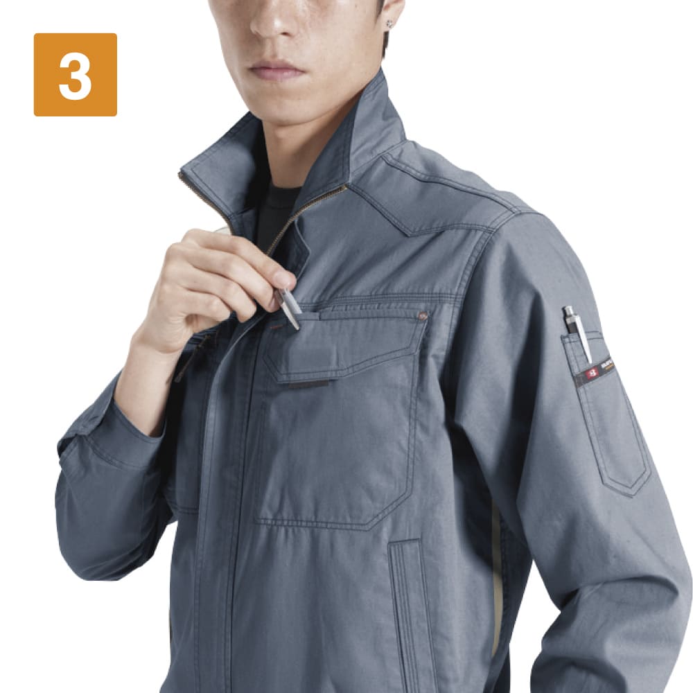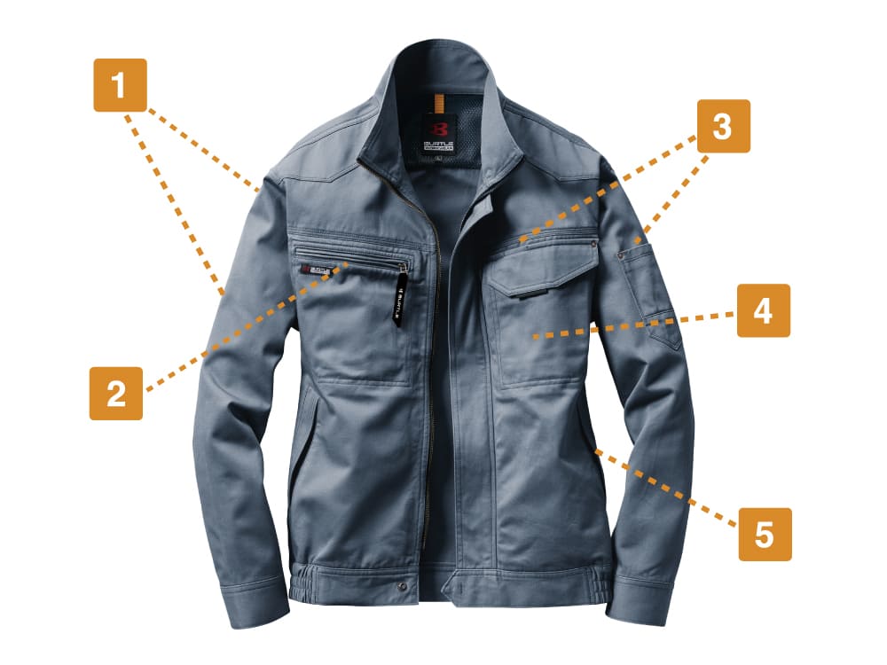 バートルが送り出す、ライトな高機能ワークウェア。肌ざわりのいい本体生地は、優れた防縮性能を備えることで気軽に洗濯可能です。脇部分にはメッシュ素材を使用することで通気性をアップ。さらに背中部にはメッシュ素材の背当てが配置され、蒸れによる不快感を軽減しています。さらに、動きやすさがとことん追求されているのもポイント。収納力にも優れ、スマートフォンがすっぽり収納できるポケットやペン差し付きポケットなど、機能性抜群のポケット配置で作業効率をアップしています。
