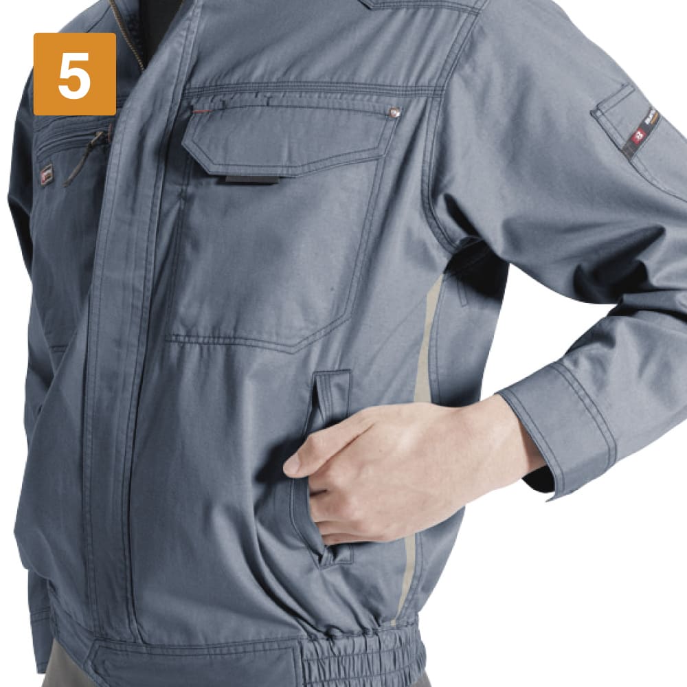 あらゆる作業を快適にしてくれるスタイリッシュワークブルゾン。さらりと着こなせるライトな生地を使用し、長いシーズン着用できる一着になっています。本体生地には吸汗性を備えた日本製綿100%ライトツイル素材を採用。風合いがよく、さらに製品洗い加工によってソフトな肌触りと着心地の良さをプラスしています。また、動きやすさにもこだわり、袖にはアームタック、背にはアームノーフォークが設けられることで、腕や上半身の可動域を大幅にアップしています。