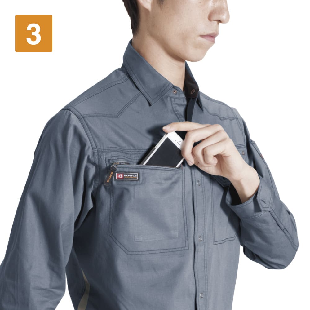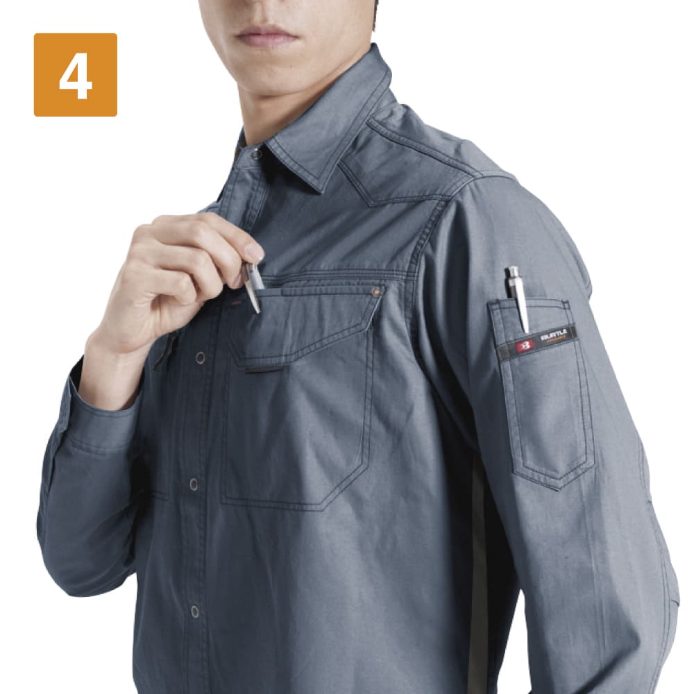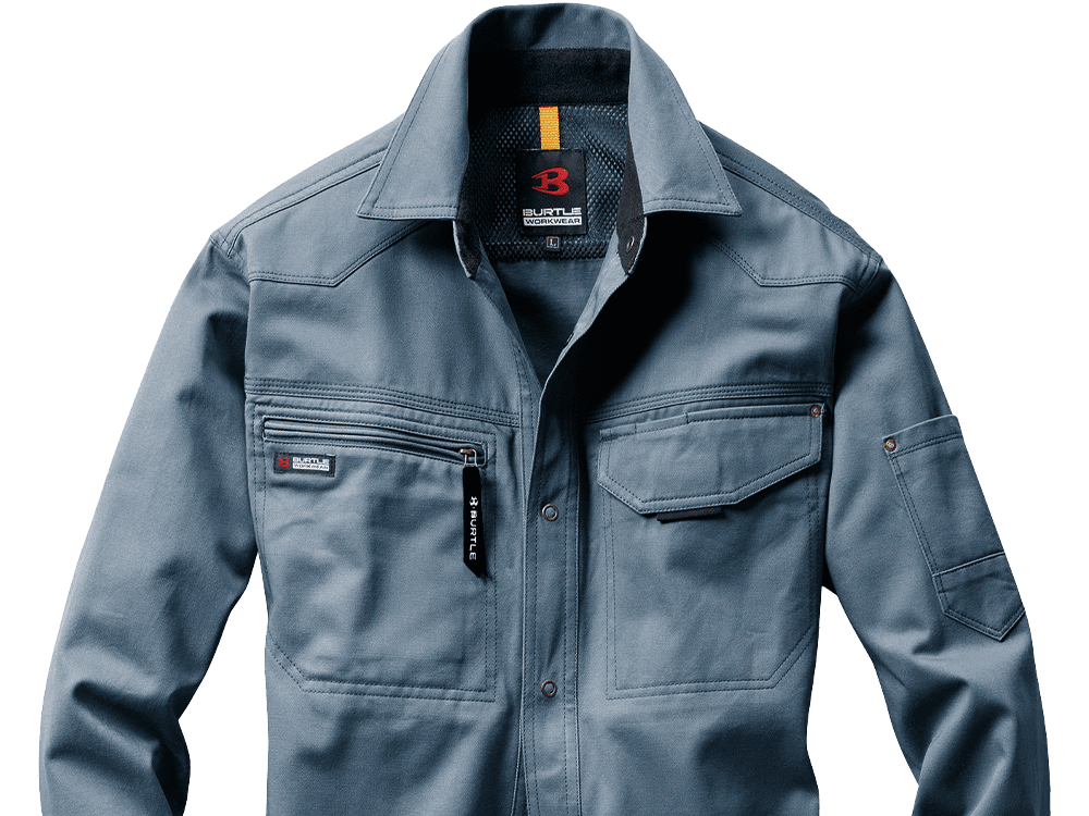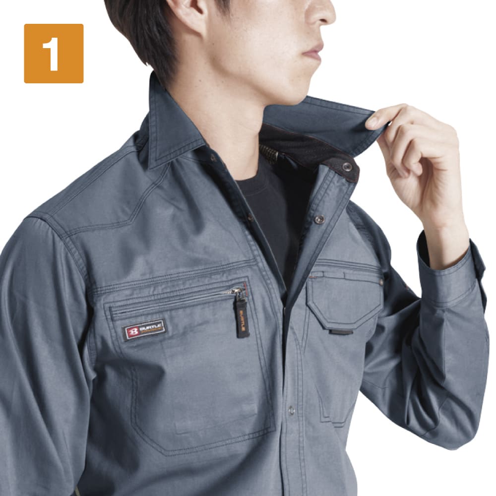 スタイリッシュなワークスタイルを叶える長袖シャツ。ほどよいフィット感ですっきりと仕立てられたシルエットが、スマートな姿を演出します。本体生地には、優れた吸汗性を持つ日本製綿100%ライトツイル生地が使用されています。軽やかな着心地で、洗いをかけることでさらにソフトな風合いに。動きやすさにもこだわり、背中のアームノーフォークや袖のアームタックで動きの成約を最小限に抑えています。メッシュ素材を両脇と背当てに使用することで、通気性をアップしているのもポイント。