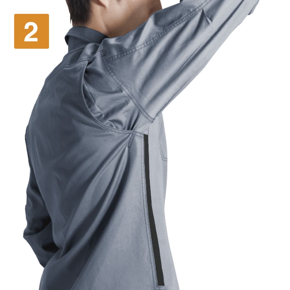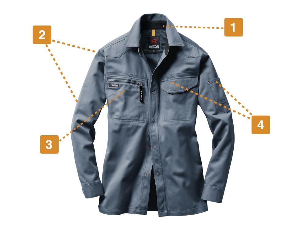 優れたデザイン性はもちろん、快適な作業をアシストする機能面も充実したウェアです。脇部分のメッシュボディークーラーや背当てなど、メッシュを効果的に使用することで抜群の通気性を確保。汗をかいても蒸れを外に逃がしてノンストレスな着用感をキープします。また、ネック部分には吸汗ニットが使用され不快なべたつきをカット。収納面も充実し、右胸のスマートフォンも大判収納ポケットや2ヵ所のペン差しなど、小物をすっきりと持ち運び可能です。
