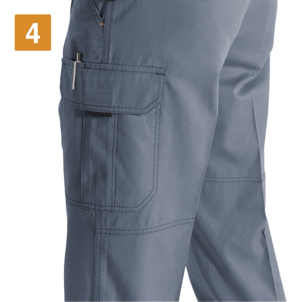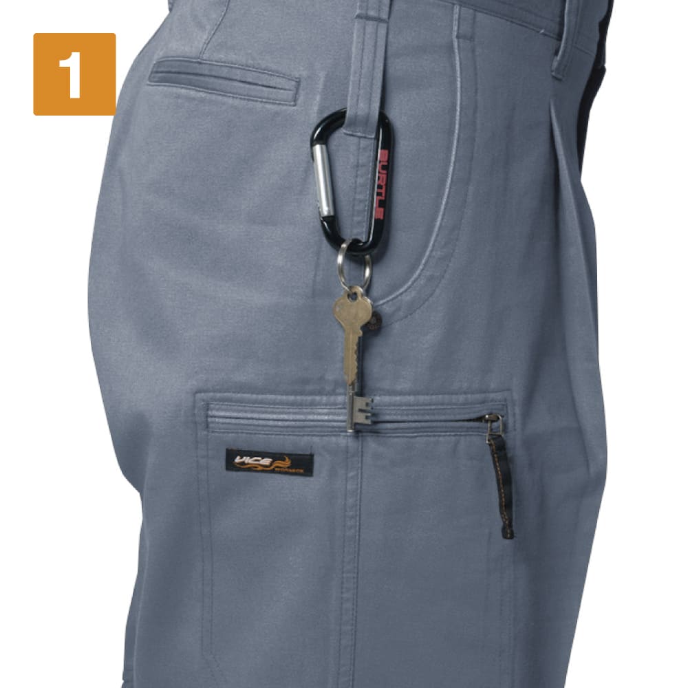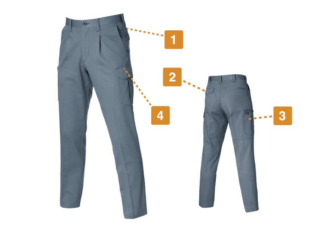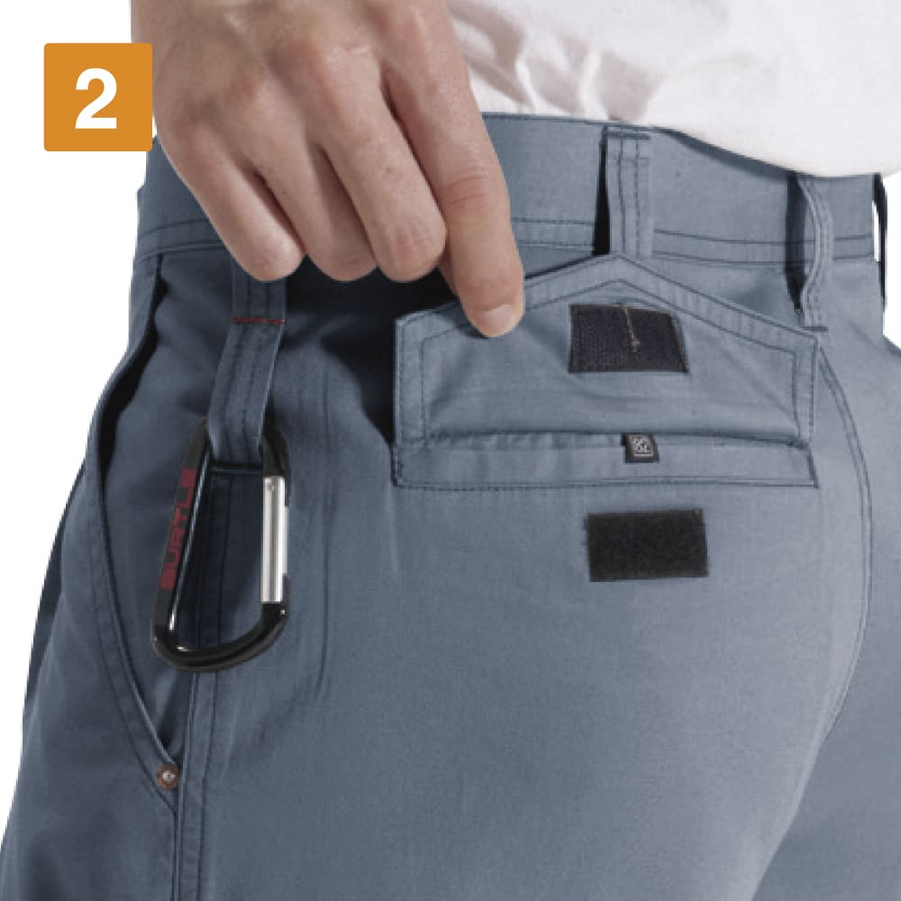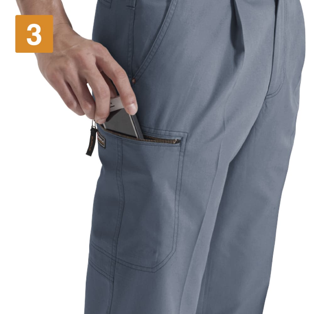 機能性をアップするディテールが満載のワークパンツ。吸水性に優れ、汗をかくシーンでも快適に作業ができるウェアになっています。収納も充実し、左のカーゴポケットはペン差し付き。また、右脇にはスマートフォンも収納できる大判ポケットが配置されています。左のカーゴポケットはマジックテープで確実に閉じるビスフラップ付きで、中の物が落ちにくいのもポイント。両脇にはカラビナなどをひっかけるのに便利なツインループ付きです。
