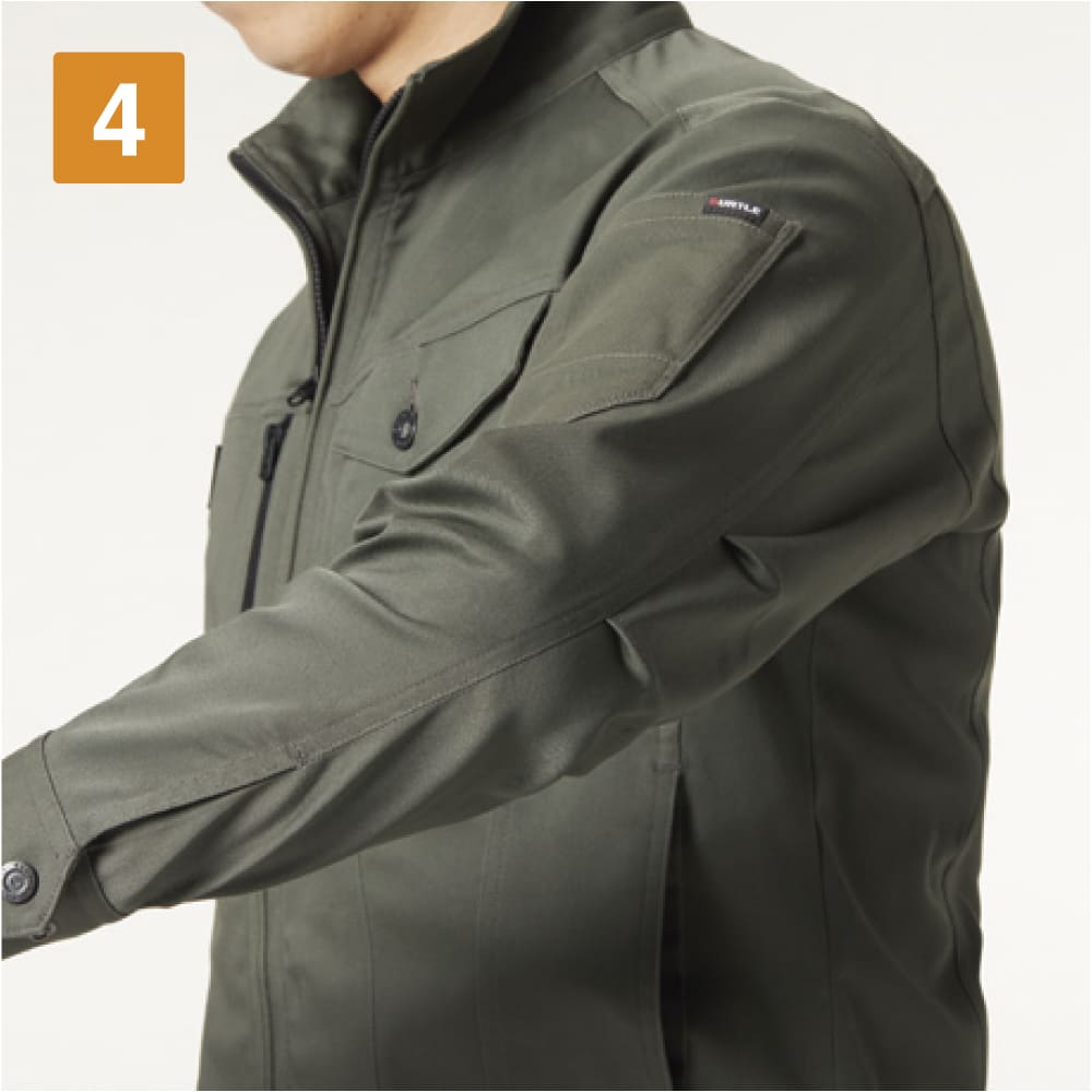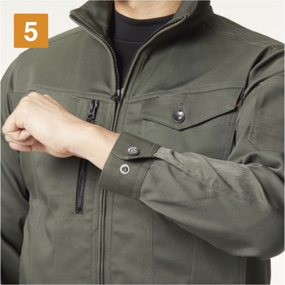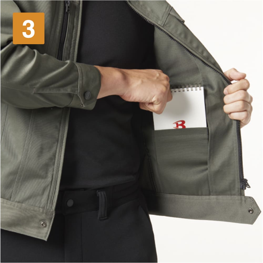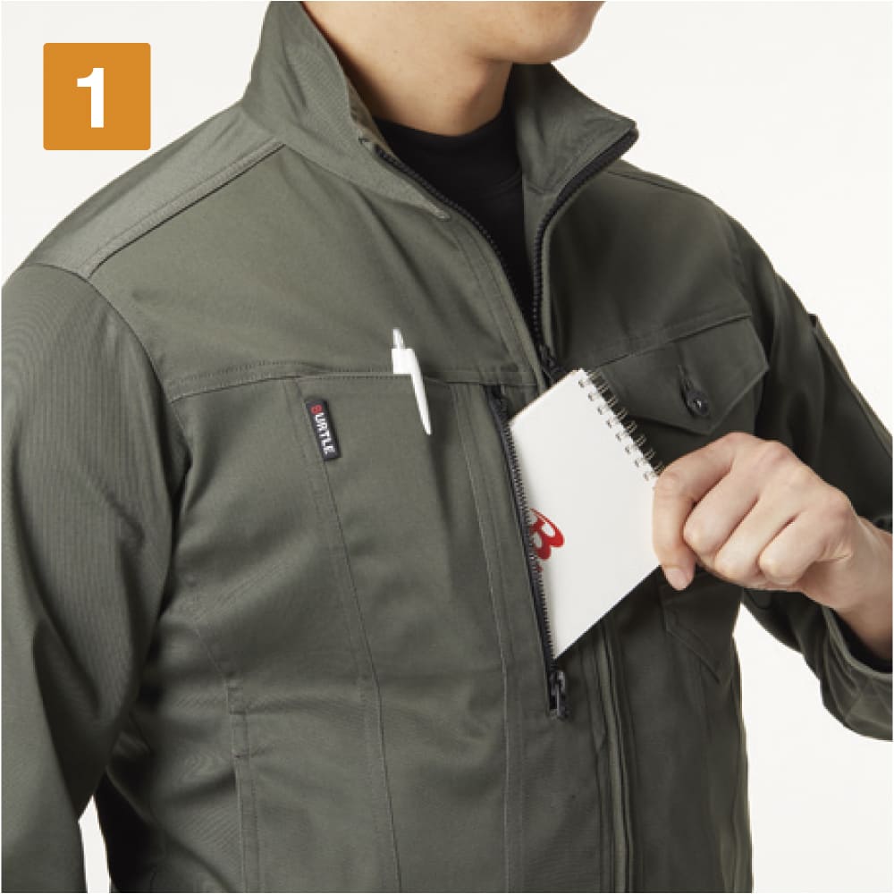 作業性をアップするためのディテールが満載のジャケット。右胸にはスマートフォンもすっきり収納できるファスナーポケット、左胸にはペン差しつきのポケットが配置され、小物を整理して収納できます。さらに左内側にもポケット付き。また、左袖にはペンポケットが設けられ筆記シーンの多いお仕事にも。動きやすさにもこだわり、袖にはアームタックが入ることで腕の可動域をアップ。カフスにはドットアジャスターが付いており、袖口のフィット感調整も簡単に行えます。