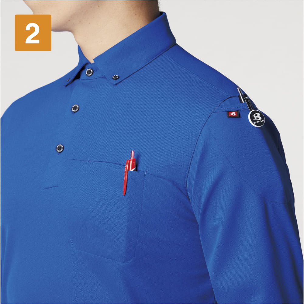 吸汗速乾、消臭、90%以上のUVカット率など快適性をアップする機能を備えたオールシーズン快適に着用できる一着です。帯電防止性に優れ、JIS T8118に適合しているのもポイント。また、ディテールにも注目のウェア。収納は左胸ポケットと左袖のマルチポケットの2ヵ所に配置され。ペンやカギなど小物もすっきり持ち運び可能です。脇には消臭テープが配置されることで不快な汗のニオイをカット。伸長率25%以上のストレッチ性と脇スリットで動きやすさも抜群です。