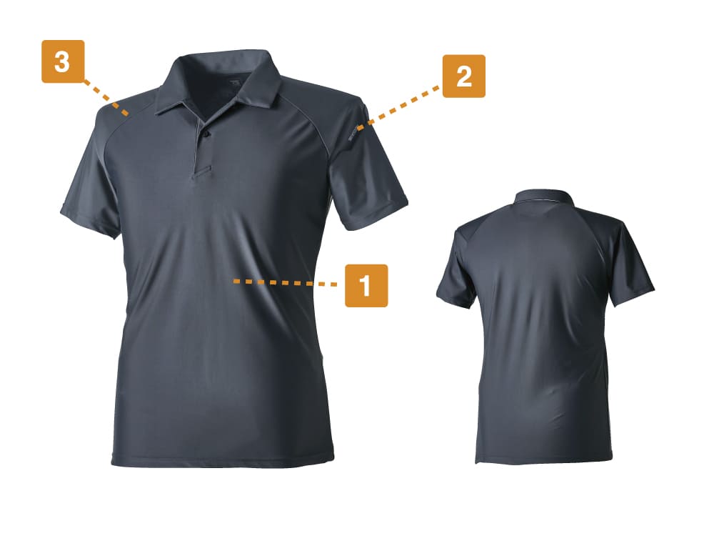 シンプルながらもディテールにこだわったスタイリッシュなポロシャツです。接触冷感性に優れたクールアイス素材を使用した、夏のワークシーンをとことん快適にしてくれるワークウェア。肌に触れたときのひんやり感が心地よく、吸汗速乾性にも優れていることで汗をかいてもからりとした着用感が持続します。また、ストレッチ性能によりあらゆる動きに柔軟に対応。肩はラグラン仕様で肩回りの動きもスムーズに。ノンストレスな作業をアシストしてくれるウェアです。