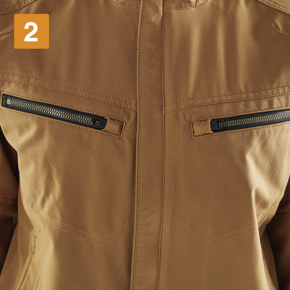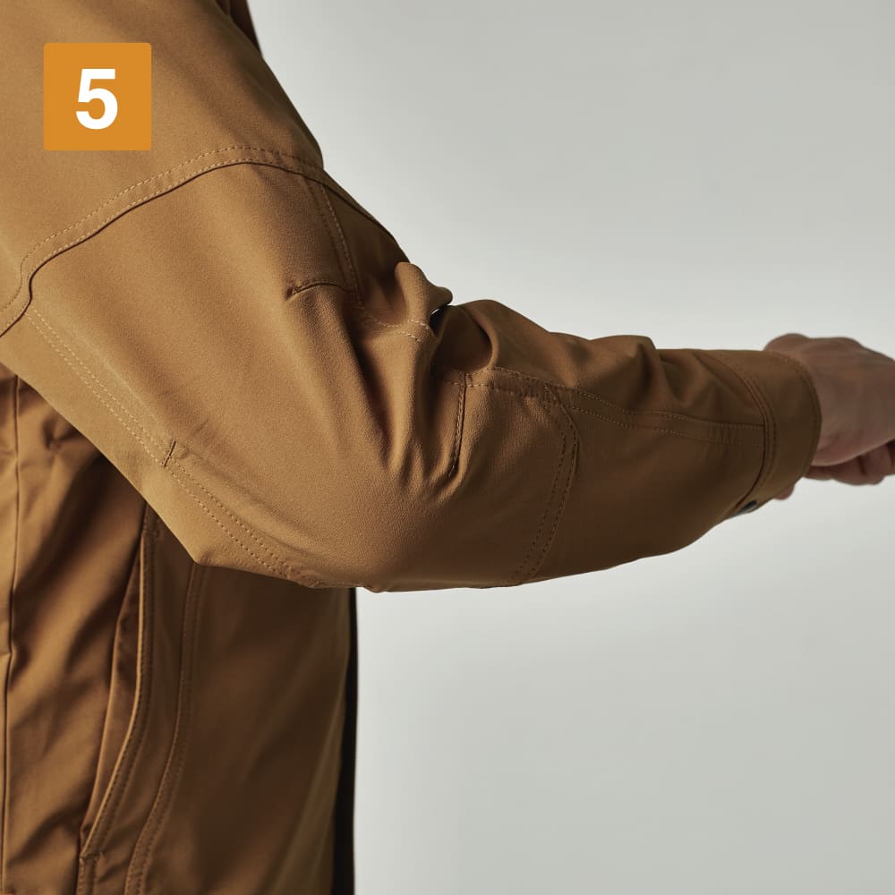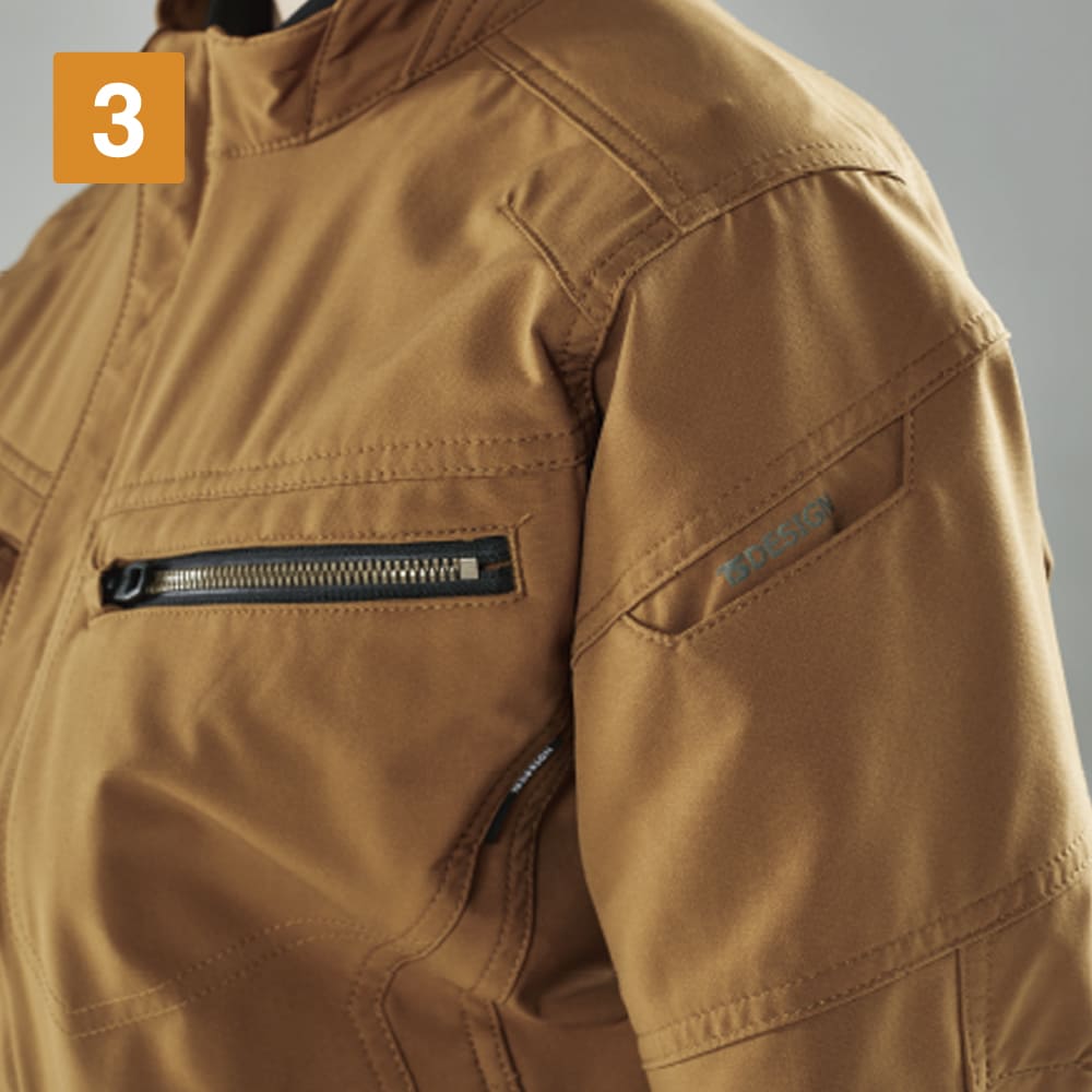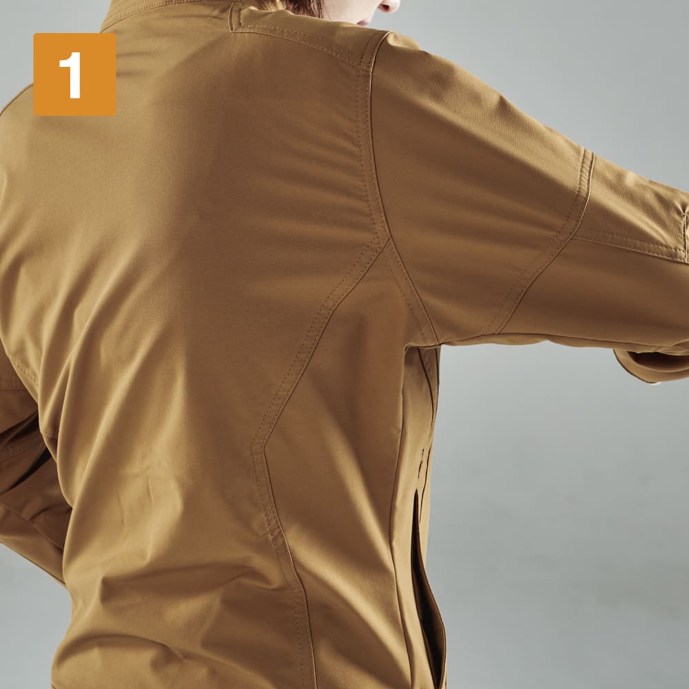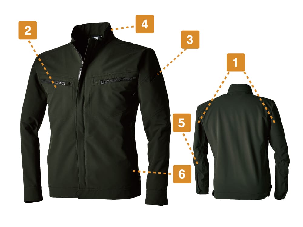 ドライな着用感が心地いい、さっと羽織れるライトなジャケット。TSエコダブルライトクロス素材は、環境に優しいエコ素材。生地は点接触で汗をかいても肌に貼りつきにくく、ドライな肌ざわりをキープ。さらに吸汗速乾加工により、汗をかいてもすぐに乾いて夏場でも快適に着用いただけます。ストレッチ性により大きな動きもストレスを感じさせません。肘部分は立体的に組み立てられることで、腕の可動域をアップ!抜群の作業性を誇るウェアです。