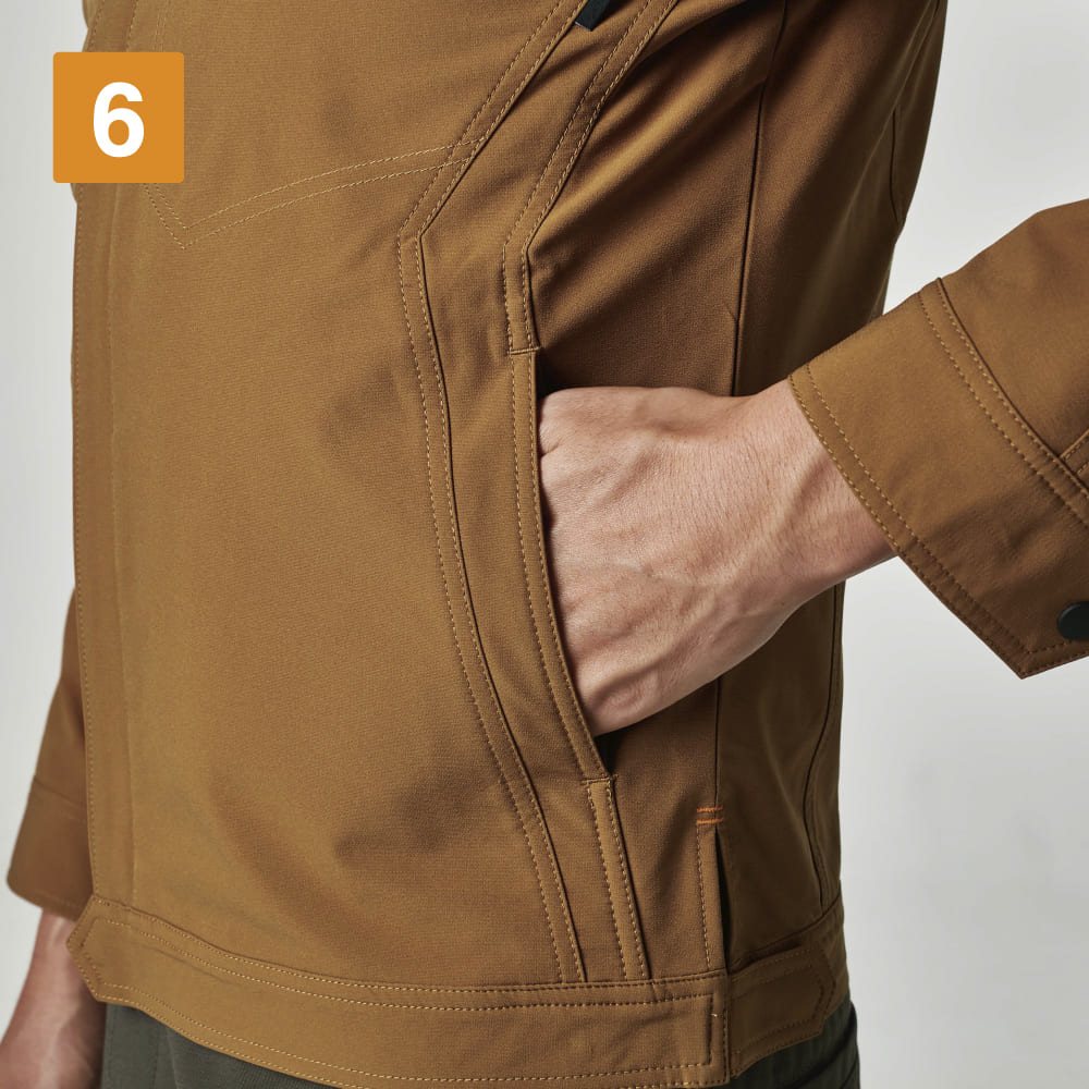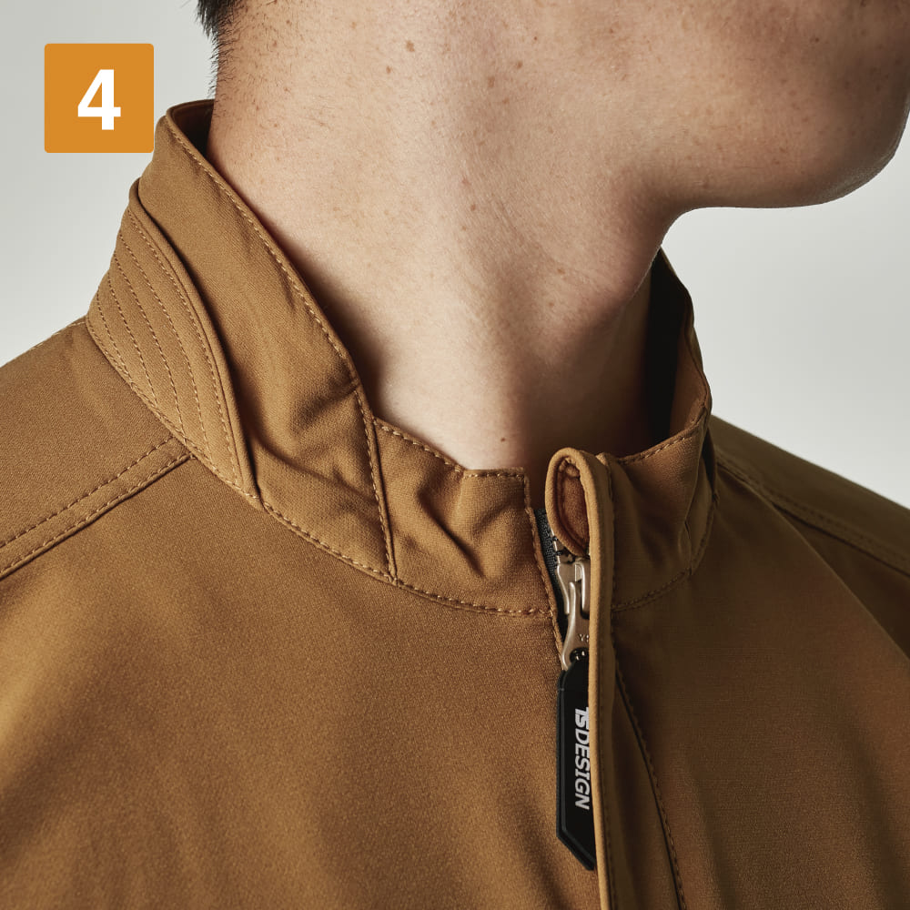 夏特化型の軽量&快適ブルゾン!シンプルでスタイリッシュ、左袖にはのマルチスリーブポケットがさりげないアクセントになったワークジャケット。環境に優しいバイオ素材を使用したエコな一着です。生地と肌が点で接触するドライな肌ざわりとストレッチ性で着ている間じゅう快適に。また、首元はファスナーを上まで上げても生地が顔に触れないグルーブネックデザインで、個性をプラスしながらよりノンストレスな着心地になっています。
