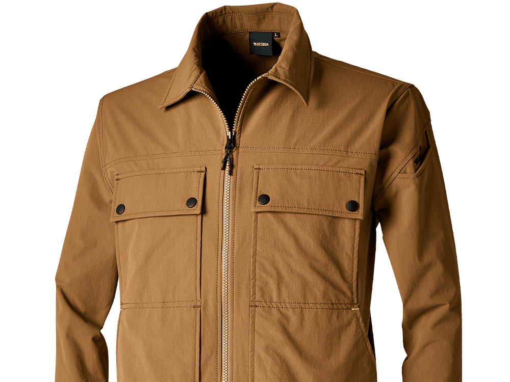 耐久性とタテヨコに自在に伸縮するストレッチ性を兼ね備えた高機能ジャケット。タウンユースにも映えるスタイリッシュなデザインにも注目のウェアです。最大の特徴は強度の優れたコーデュラナイロンを使用していること。一般的なポリエステル素材と比較し2~3倍の摩耗強度を誇ります。 また、生地が二重織組織になっていることで、肌と生地が点で接触。汗をかいても肌に貼りつきにくく、暑い季節に長袖必須の現場でも快適に着用可能です。