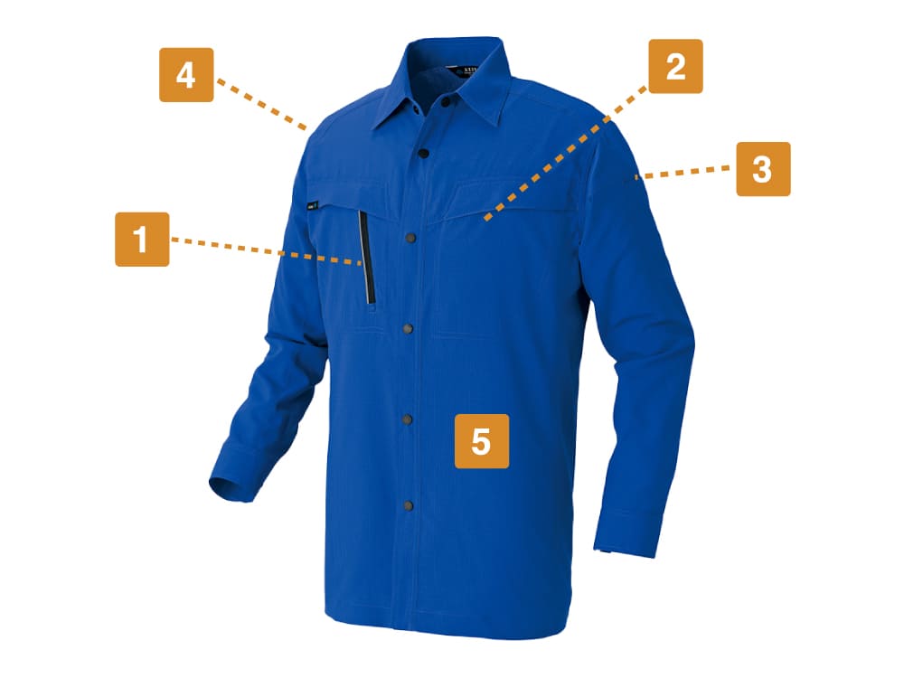 数々の機能で幅広い環境での快適&安全な作業をアシストしてくれるワークシャツです。疲れを感じさせない超軽量ボディは通気性も抜群!着ていることを忘れるほどの軽やかさで一日中ノンストレスに着用できます。また、ストレッチ性により大きな動作もつっぱり感がなくスムーズに。とにかくタフな現場で働く方にこそおすすめしたい、ハイスペックウェアです。猛暑、炎天下、夜間など、あらゆる環境下に対応し、着る方の安全を守ります。