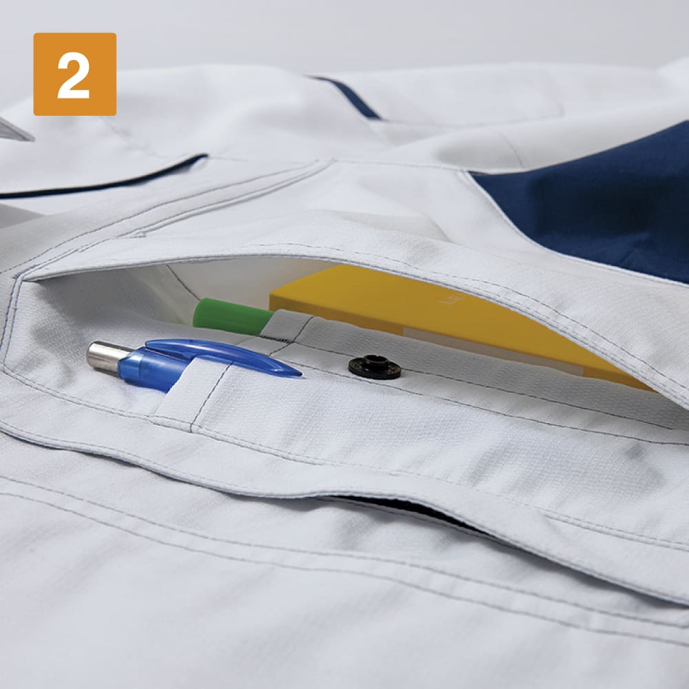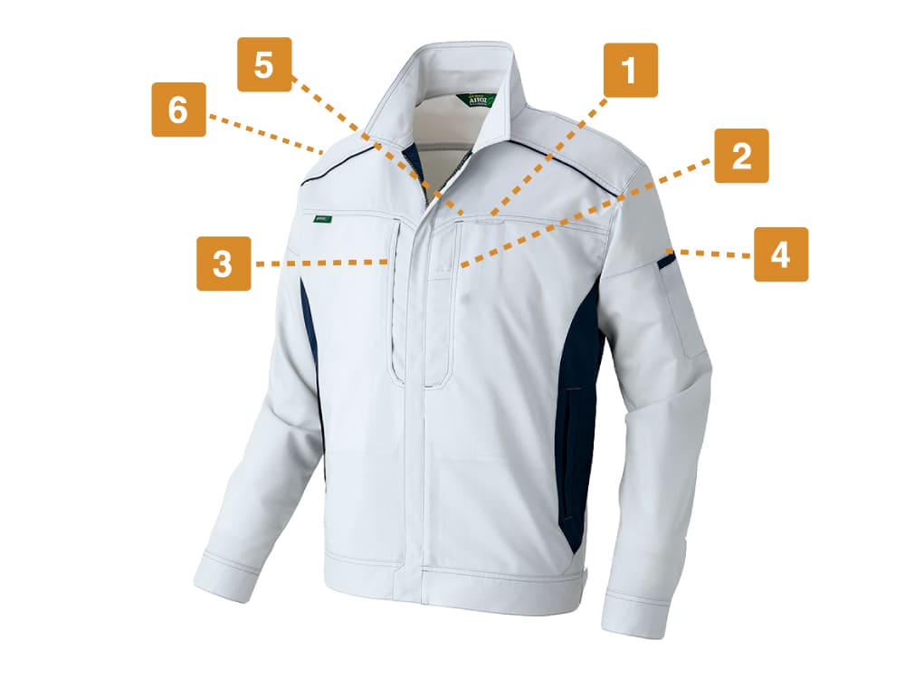 植物由来のポリエステル繊維で作られた、エコロジカルなワークウェア。生地は軽量で疲れにくく、ストレッチ性で大きな動きもスムーズ!清潔感のあるスポーティなデザインで、年齢や性別を問わずスタイリッシュに着用可能です。両脇の生地切り替えやパイピングでスタイルをすっきりとスマートに演出しているのもポイント。また、JIS規格に適合した帯電防止性能や視認性を高める反射素材によって、幅広い現場での着用に対応しています。安全な着用をアシストする一着です。