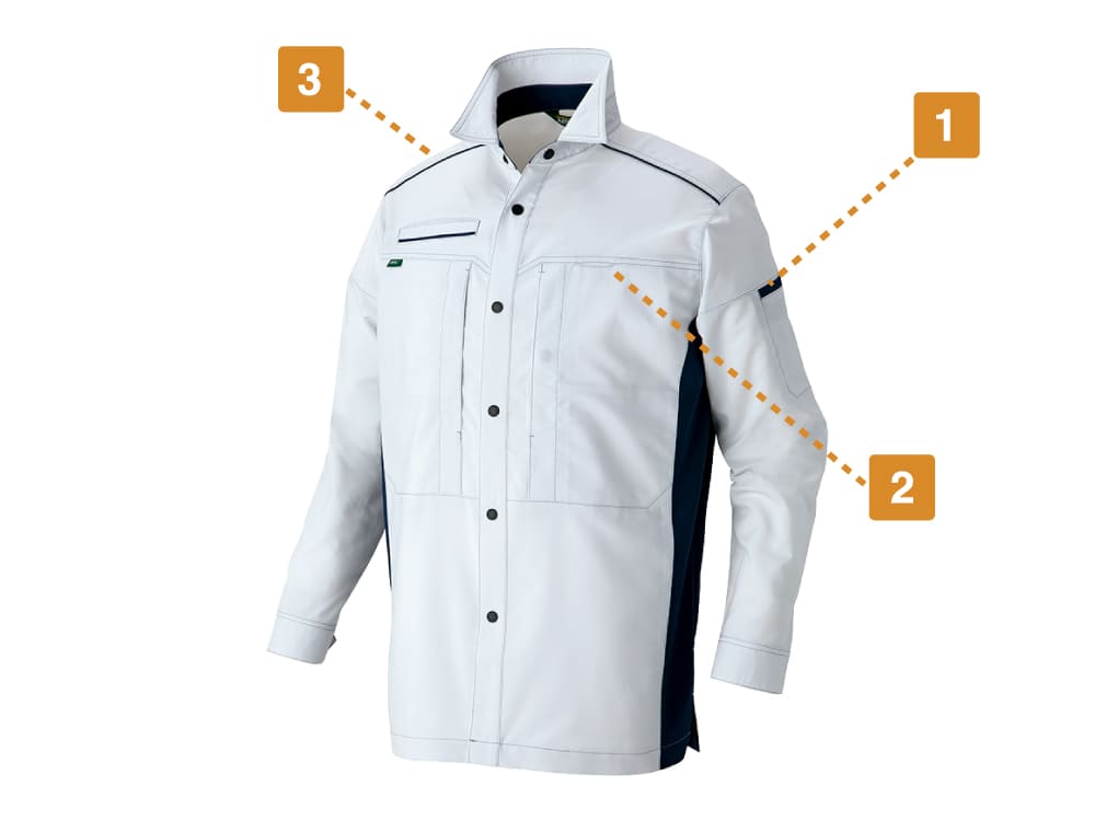 バイオマス由来の素材から生まれた、サスティナブルなワークシャツ。軽量で体への負担が少なく、抜群のストレッチ性で大きな動きもノンストレスに行えます。スポーティなバイカラーデザインは年齢や性別を問わずスタイリッシュに着られるのがポイント。両脇の生地切り替えやパイピングのアクセントがすっきりとスマートなスタイルを演出します。また、JIS規格に適合した帯電防止性能を備え、幅広い現場で安全に着用できるウェアになっています。