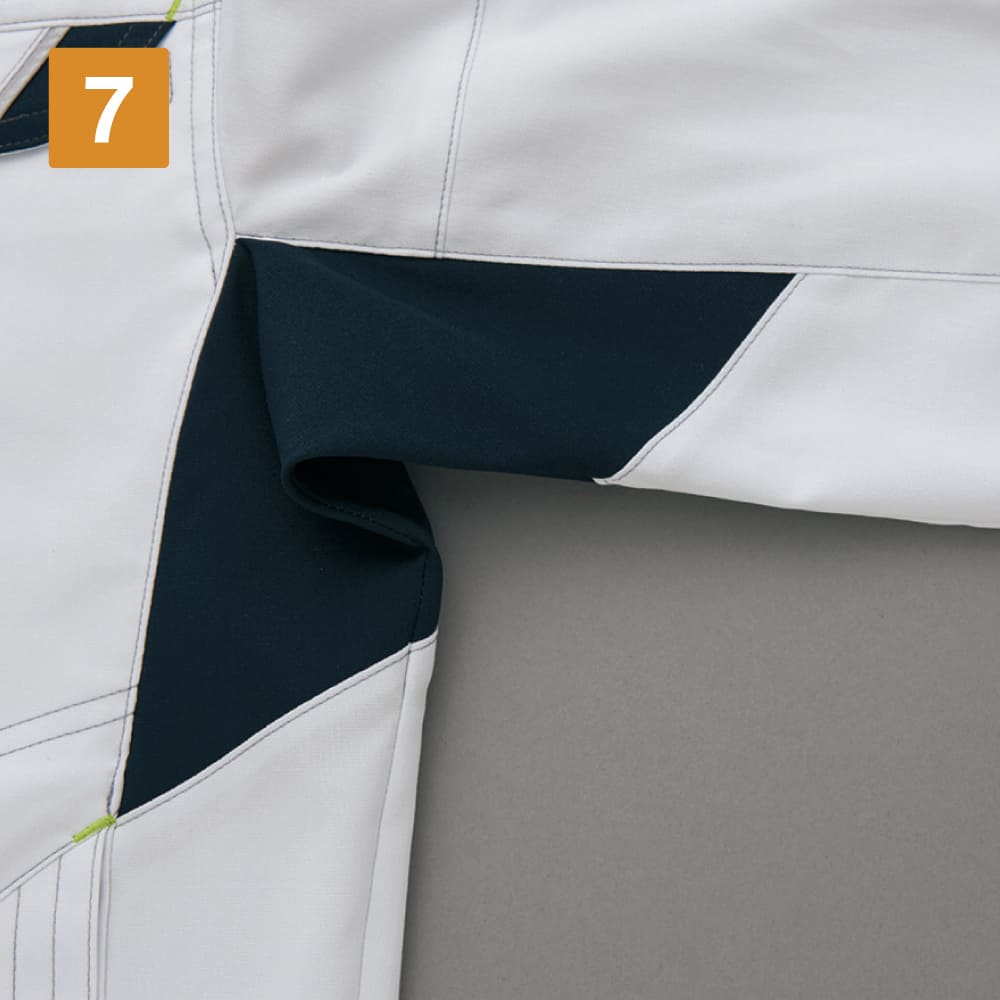 異次元の動きやすさを実現した、夏用ワークブルゾンです。生地に使用されているライトフィックスストレッチ素材は、軽量でありながら非常に高い伸縮性を持つのが特徴。伸びるだけでなく復元力も優れており、ストレスのない動きをアシストします。型崩れしにくく、扱いやすいのもポイントです。さらに、3D着圧データに基づくカッティングでさらに動きやすさをアップしています。また、吸汗速乾性を備えることで、汗によるべたつきを抑え、暑い季節も快適に着用できるウェアになっています。