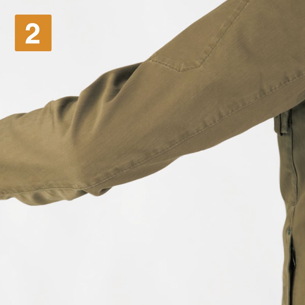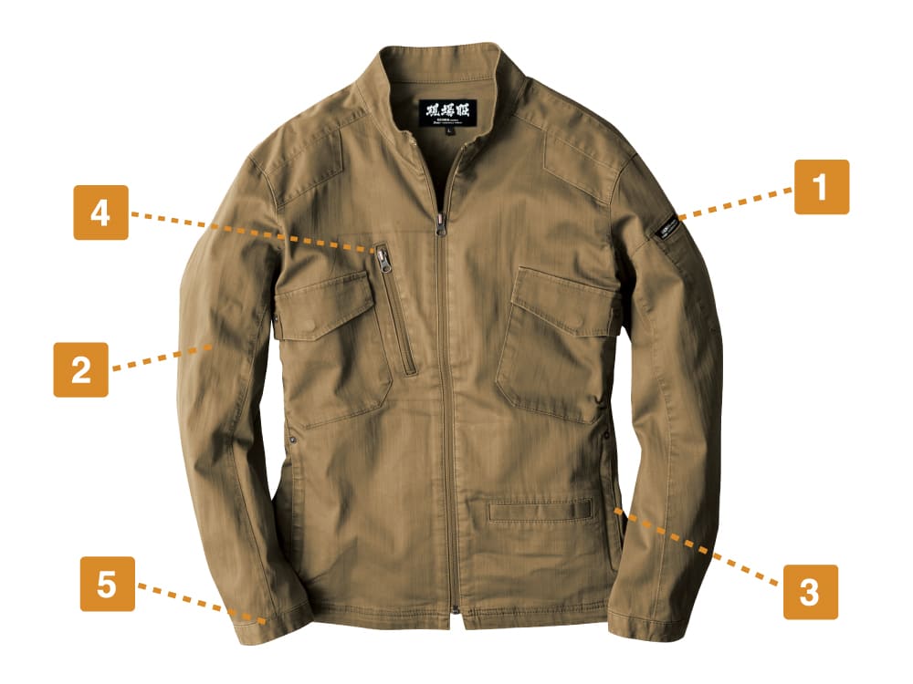 ミリタリーウェアを思わせる味わい深い質感と、ライダースジャケットを引用したデザインでスタイリッシュなワークスタイルを演出してくれる一着です。ほどよいフィット感ながら、ストレッチ性に優れた生地が使用されることで動きやすさ抜群。ヒジ部分には立体カッティングが施され、腕まわりの可動域もアップしています。袖口のカフスアジャスターでフィット感調整も可能で、幅広い作業環境に合わせて着用できる一着になっています。