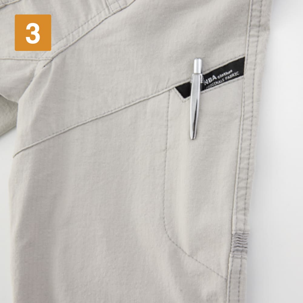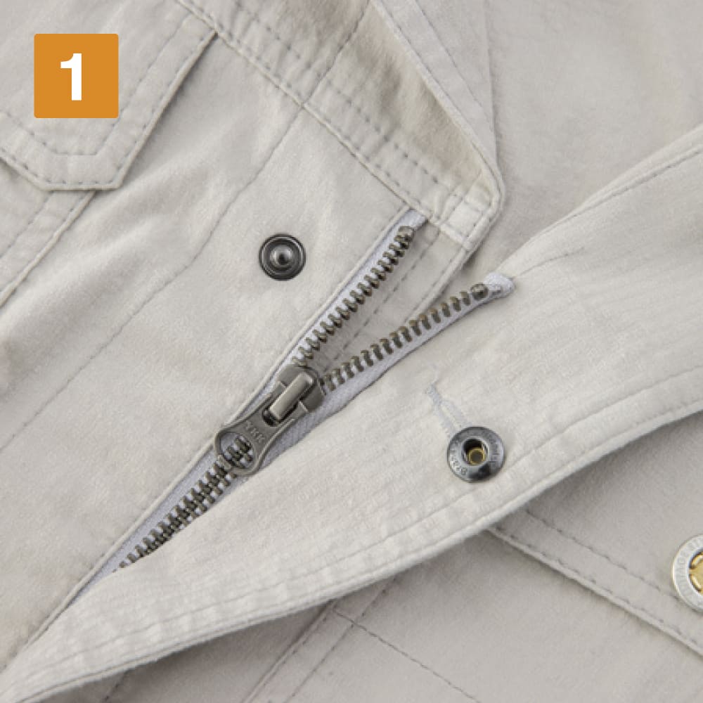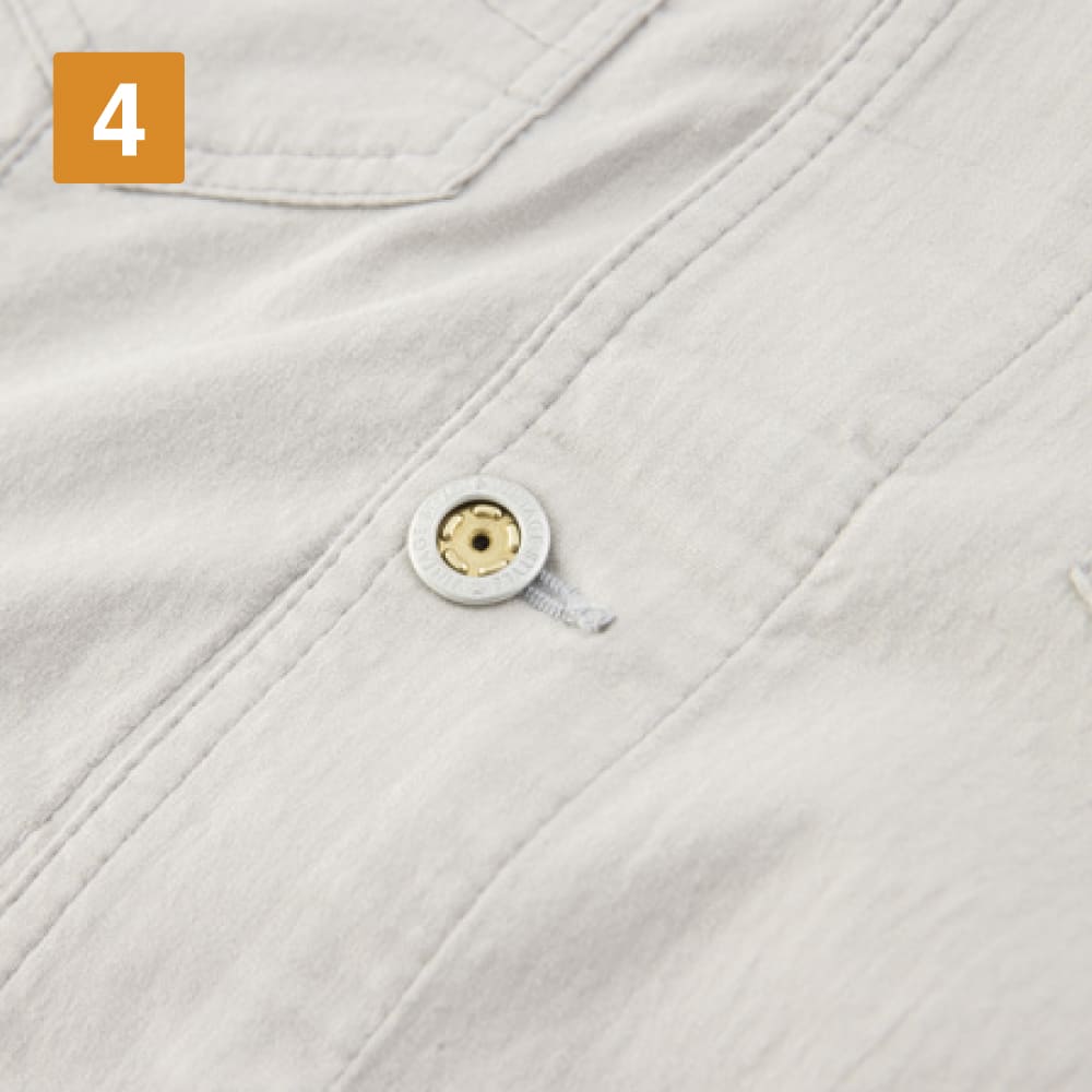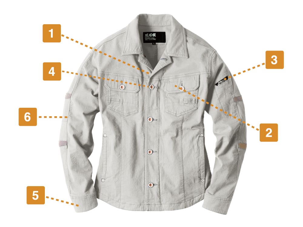 スタッフのおすすめポイントは、ファスナーだけでなくボタンでも留められる2WAY仕様のデザイン!これまでのワークウェアにはないこなれたカジュアル感のあるデザインで、着こなしのアレンジ幅もグンと広がります。袖口のアジャストボタンで腕まくりもスムーズです。バイオウォッシュ加工で仕上げた生地は、そのこなれ感もさることながら抜群の肌ざわりのよさが持ち味。軽やかで風通しもよく、夏場に長袖必須の現場でも快適に着用できます。