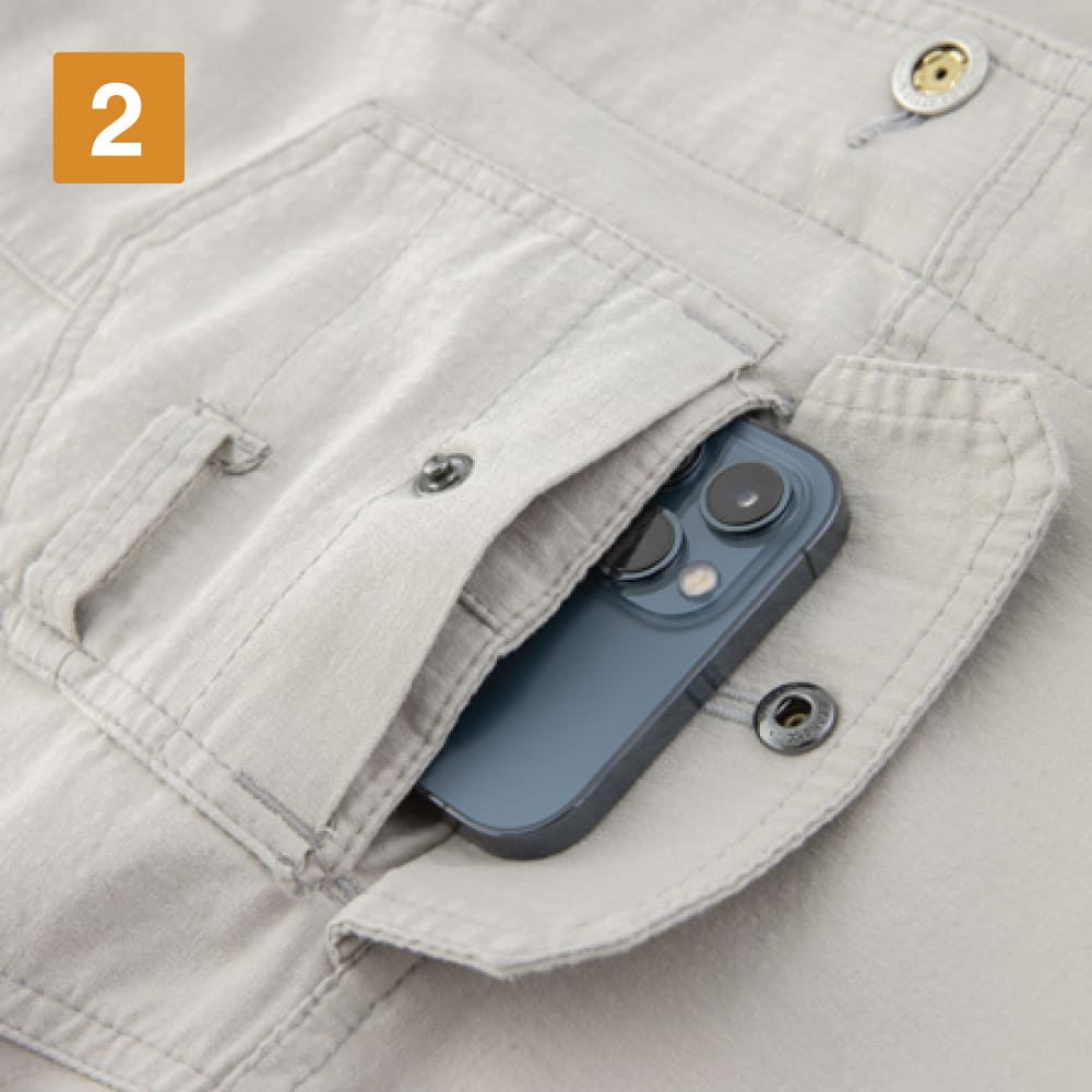 左胸はダブルポケットで長物・スマホポケットにピッタリ