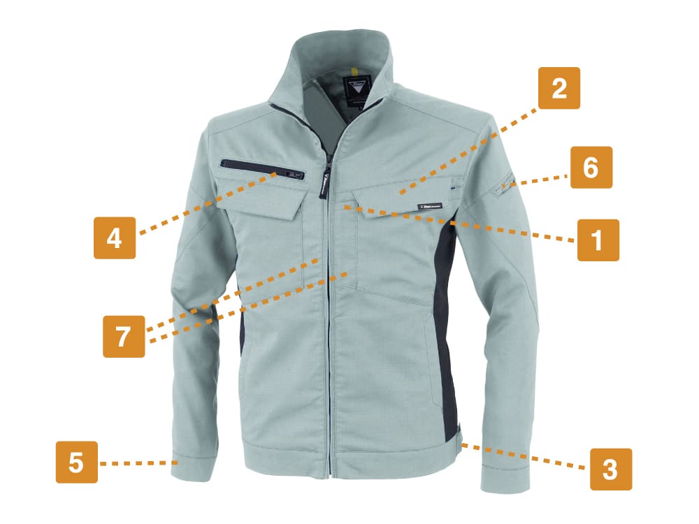 ノンストレスな現場作業をアシストしてくれる、スポーティなワークブルゾン!両脇部分の生地が切り替えられることで、すっきりとシャープな印象にしてくれるウェアです。ほどよいフィット感がありつつも、超ストレッチ生地で動きやすくノンストレスな着用感に。袖口と裾には2段階に調整可能なアジャスターが付いており、フィット感調整もラクに行えます。バイオペット素材を使用したエコマーク認定商品で、環境にやさしいのもポイントです。