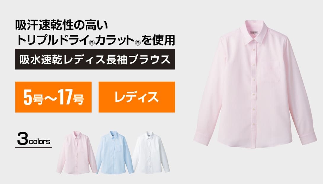 優れた吸水速乾性を持つトリプルドライ®カラット®素材を使用し、汗冷えやベタつきを抑えてくれます。肌面が凹凸状になっていて、肌に触れる凸部分が撥水ポリエステル、凹部分が普通の吸水性ポリエステルという特殊構造で、肌への濡れ戻りが大幅に軽減されているのがポイント。さらりと夏場快適であることはもちろん、防寒アウターの中で汗ばんだインナーの嫌なひんやり感も大幅に軽減し、ワーカーの味方に。女性に多い暖房などからくる、のぼせによる汗にも◎。ぜひ秋冬のインナーとしてもお使いいただきたいオールシーズンに対応する長袖ブラウスです。