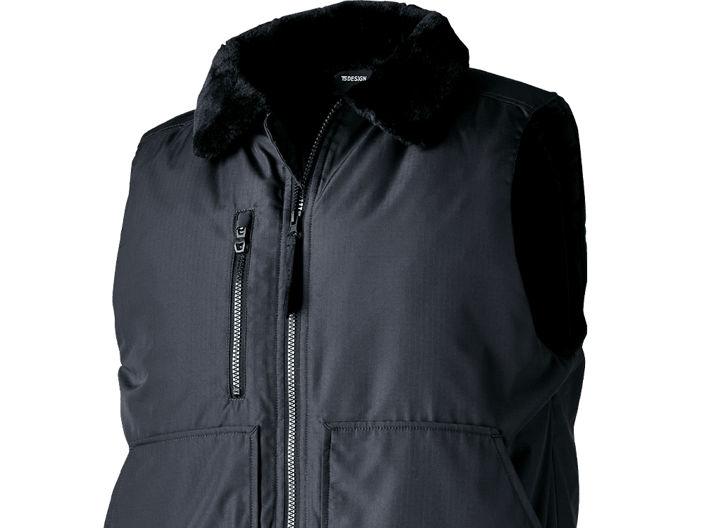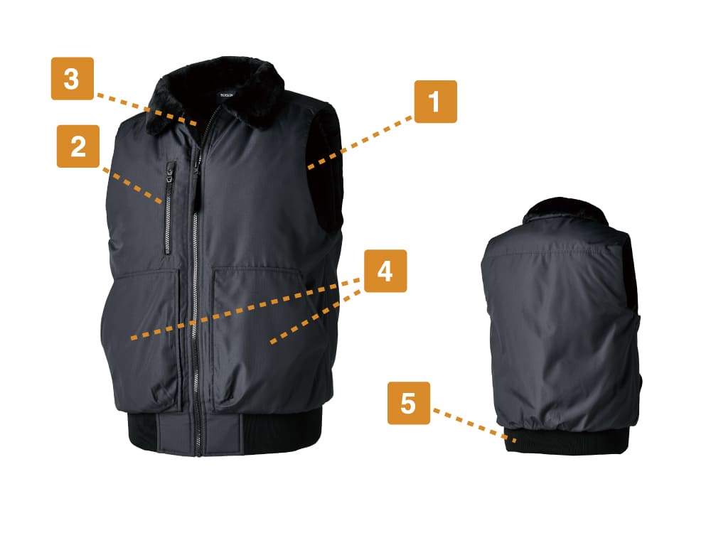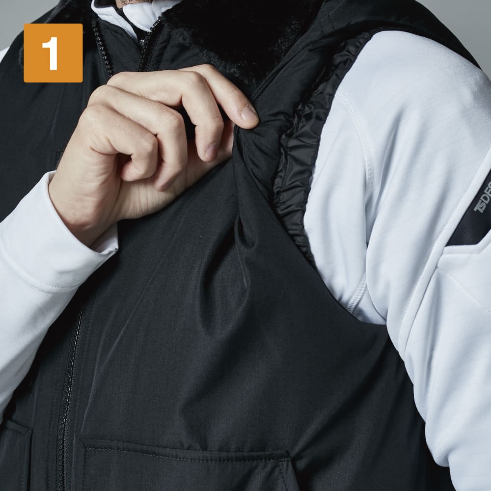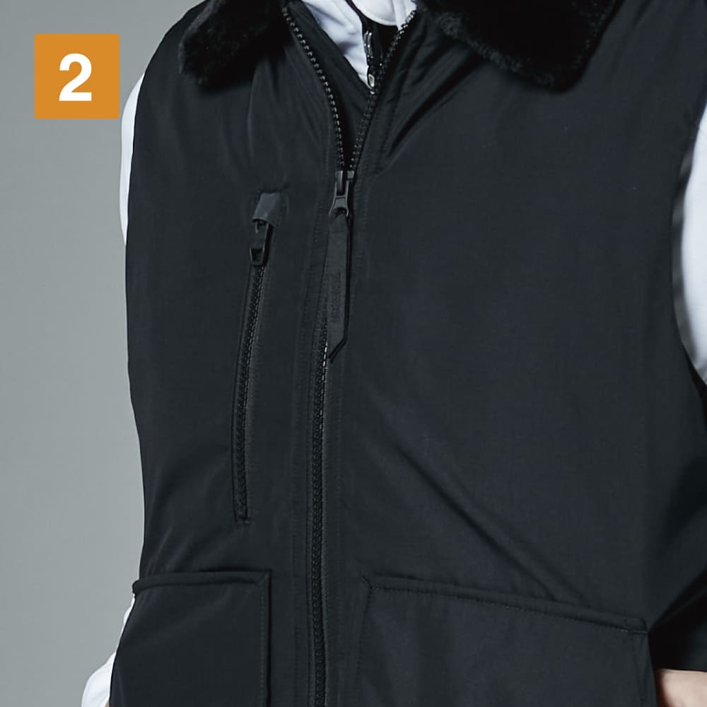フライトジャケットをベースにしたスタイリッシュなワークベスト。防寒ウェアとして秋冬に大活躍の一着です。ふかふかの中綿がしっかり体温をキープし、裏面にはPAコーティングが施されることで、防風性能もプラスされています。襟のボアで首や顔回りもあたたかく。さらに生地は撥水性も備えているため、雨や雪にも対応可能です。袖の内側部分は冷たい空気の侵入を防ぐ風止めのシャーリング仕様が採用され、より保温性を高めています。