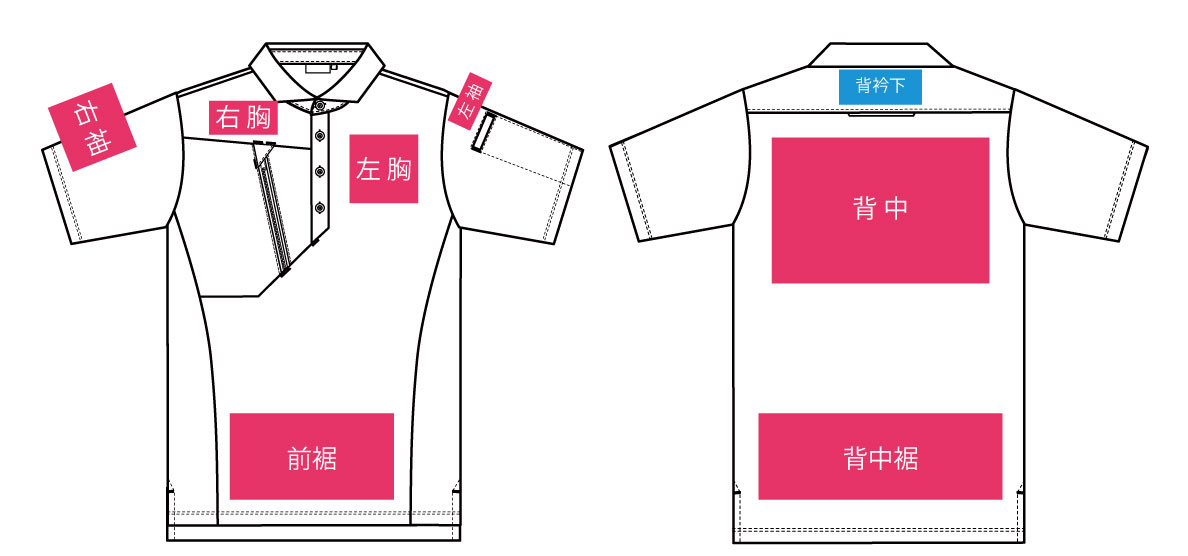ピンク部分は、刺しゅう、プリントどちらもOK。ブルー部分は、プリントのみOK。
