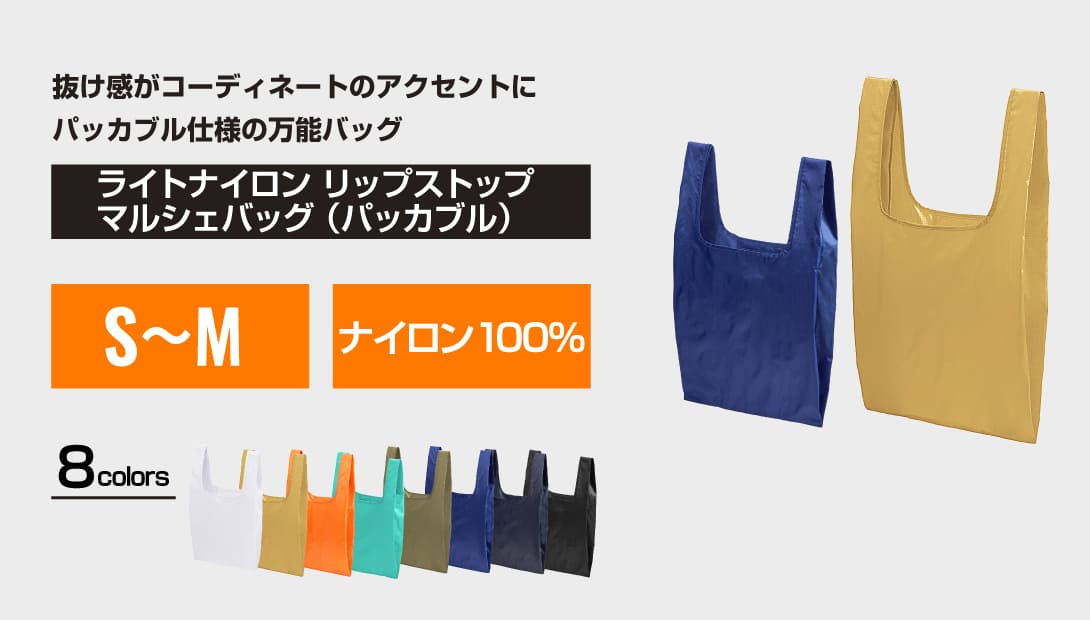 ナイロンリップストップ生地を採用した、軽くて丈夫なマルシェバッグ。内ポケットに折りたたんで収納できるパッカブル仕様で、持ち運びも簡単です。Sサイズは約12L、Mサイズは約19Lと、容量違いの2サイズ展開。日常使いからイベント、エコバッグ用途まで幅広く対応できる汎用性の高いアイテムです。加工適性も高く、プリントでオリジナルの法人向けグッズにも仕上げやすいデザインです。