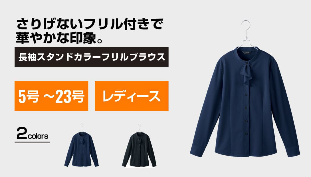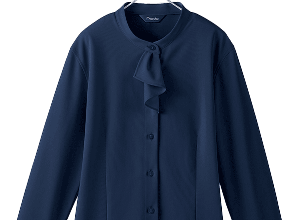 胸元のフリルデザインが華やかさと女性らしさを引き立てます。形態安定加工でノーアイロンでも美しいラインを保ち、ストレッチ素材が動きの多い業務でも快適。吸水速乾機能が汗を素早く乾かし、防汚加工で清潔感をキープ。ブラックはシックで引き締まった印象、ネイビーは柔らかく上品な印象を与えます。