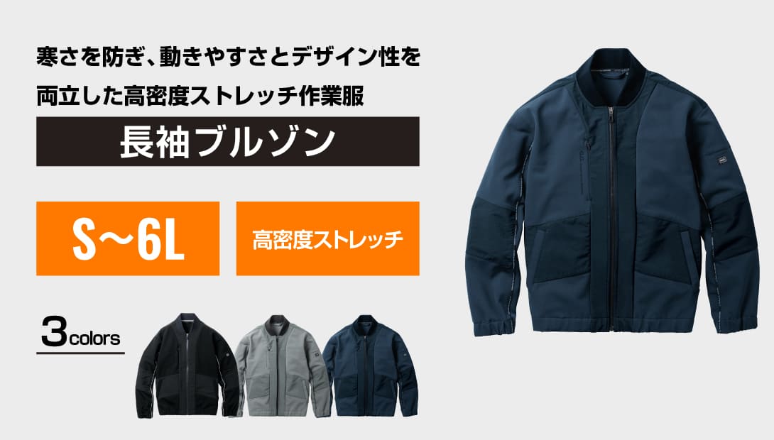 軽量で耐久性の高い高密度ストレッチ素材を使用し、防風性と快適性を両立。伸縮性に優れているため動きやすく、幅広い作業シーンに対応可能です。防臭機能を持つテープや反射プリントを備え、安全性や清潔感にも配慮。シンプルでスタイリッシュなデザインはユニフォームにも適しており、刺繍やプリント加工によるオリジナル展開もしやすい仕様です。