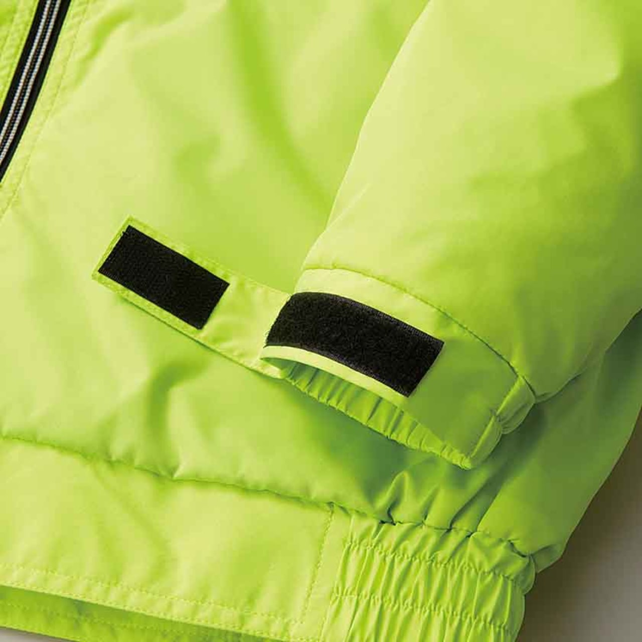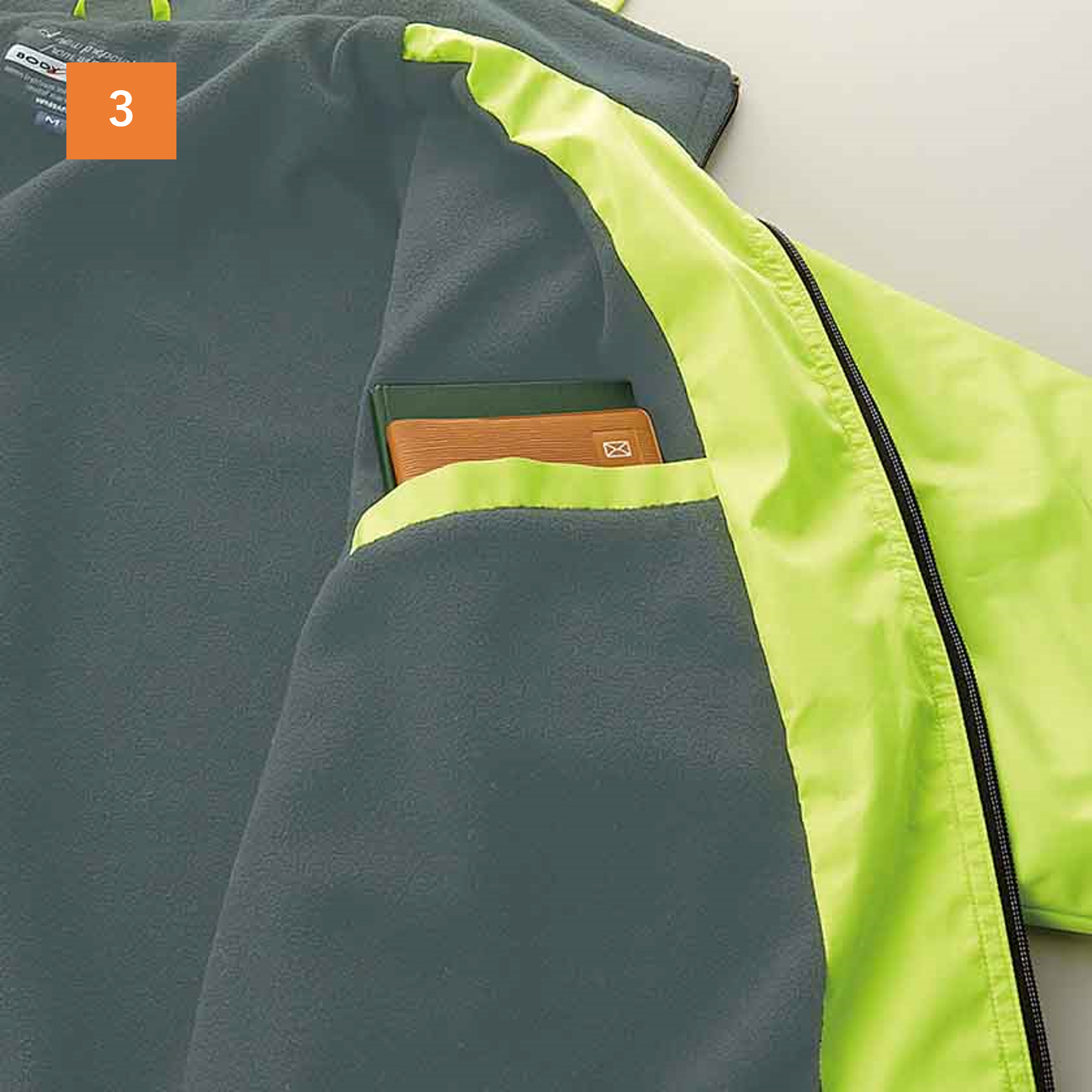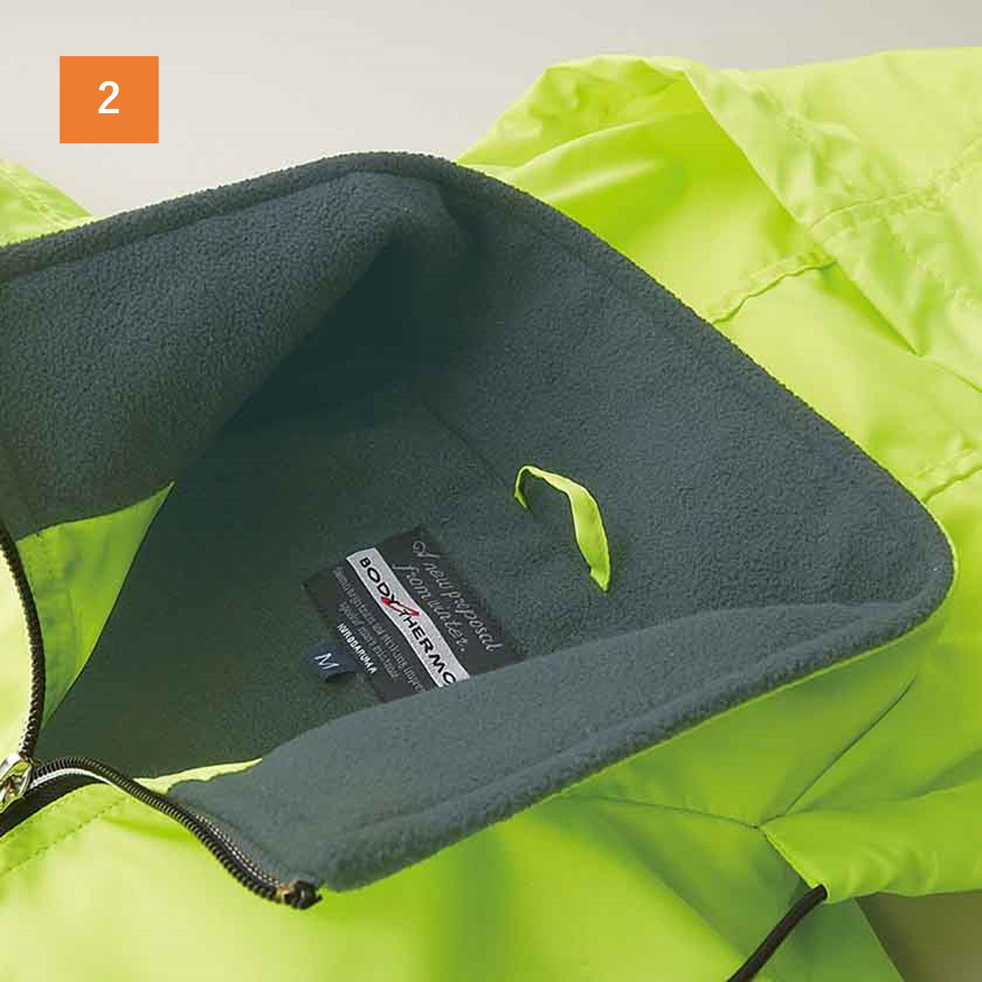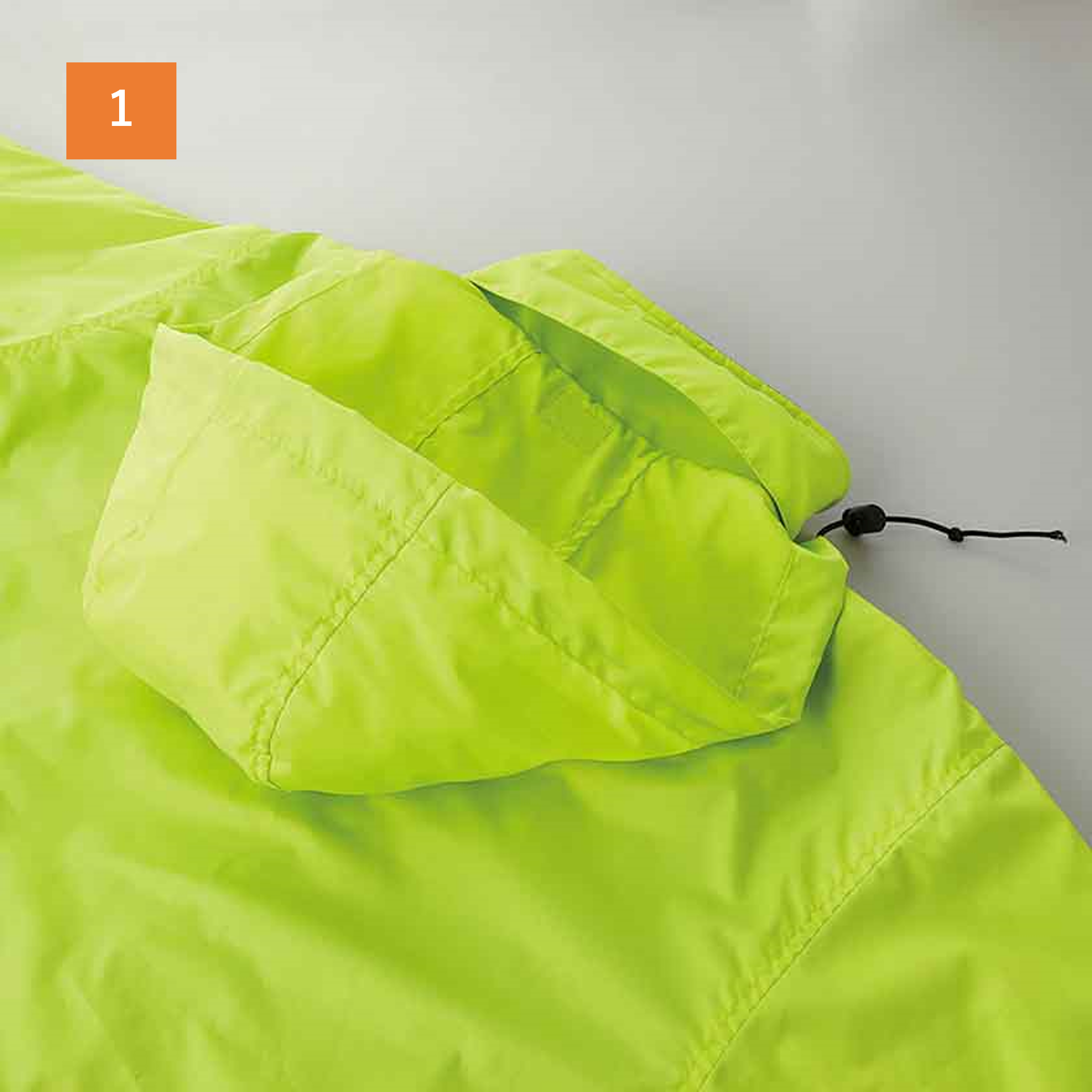 擦れてもカサカサしない、軽くて動きやすく裏フリース使いで保温性が高いです。収納式のフード、左内側と両脇には便利なポケット付きです。