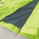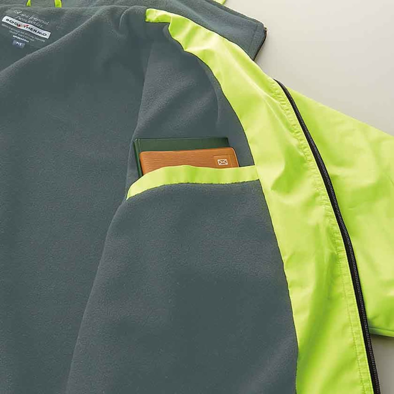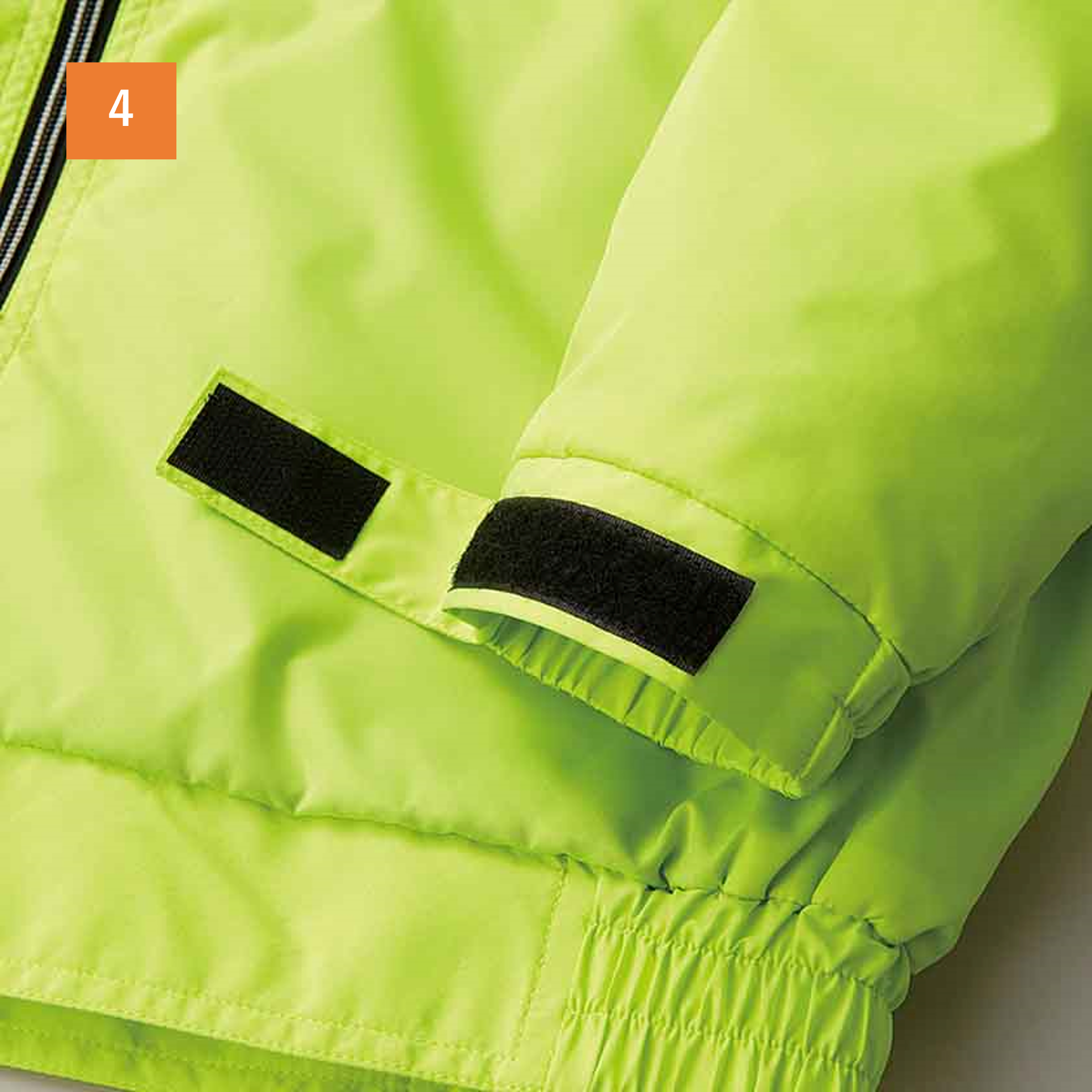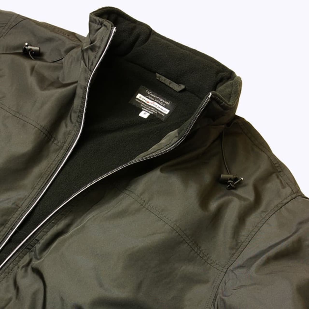 擦れてもカサカサしない、軽くて動きやすく裏フリース使いで保温性が高いです。収納式のフード、左内側と両脇には便利なポケット付きです。