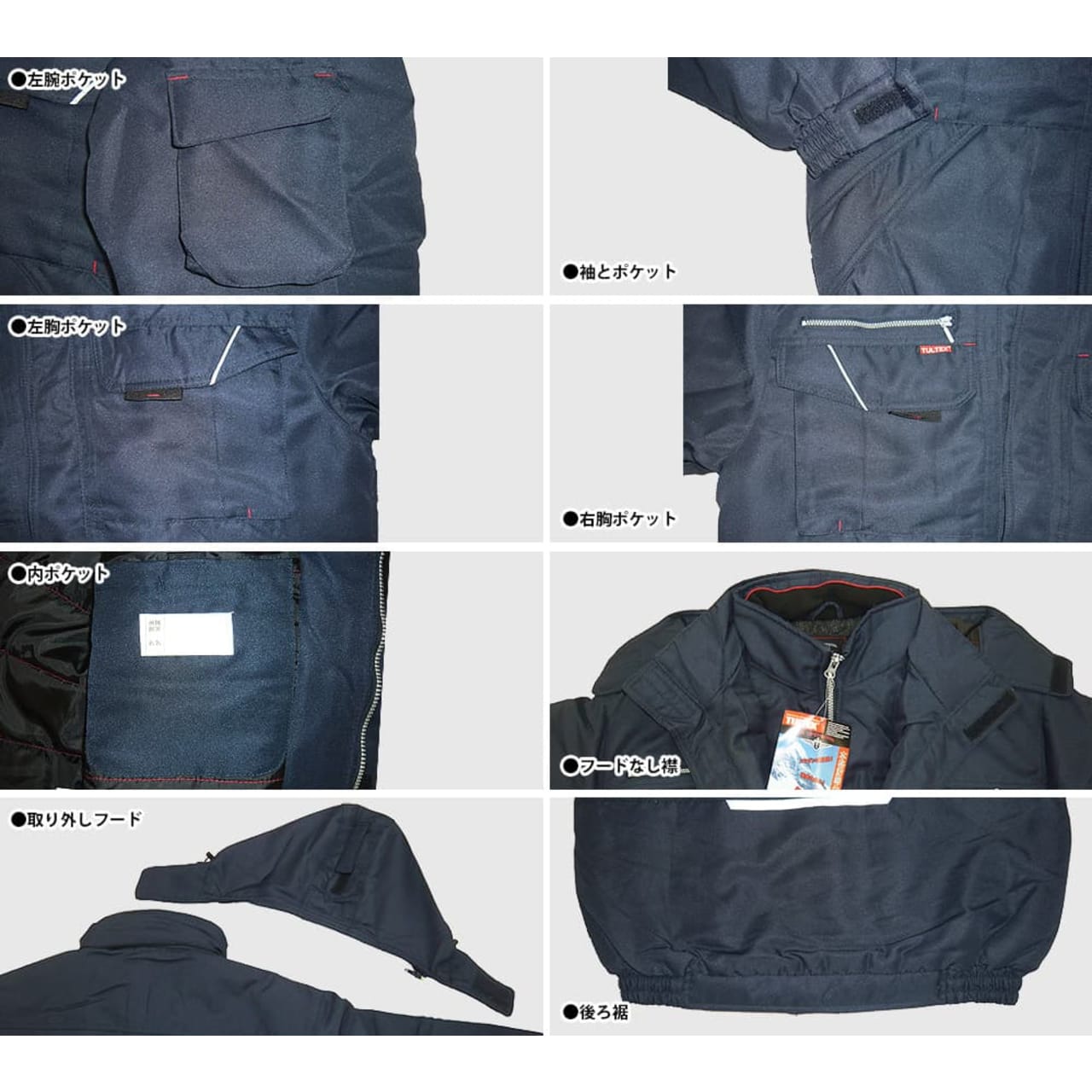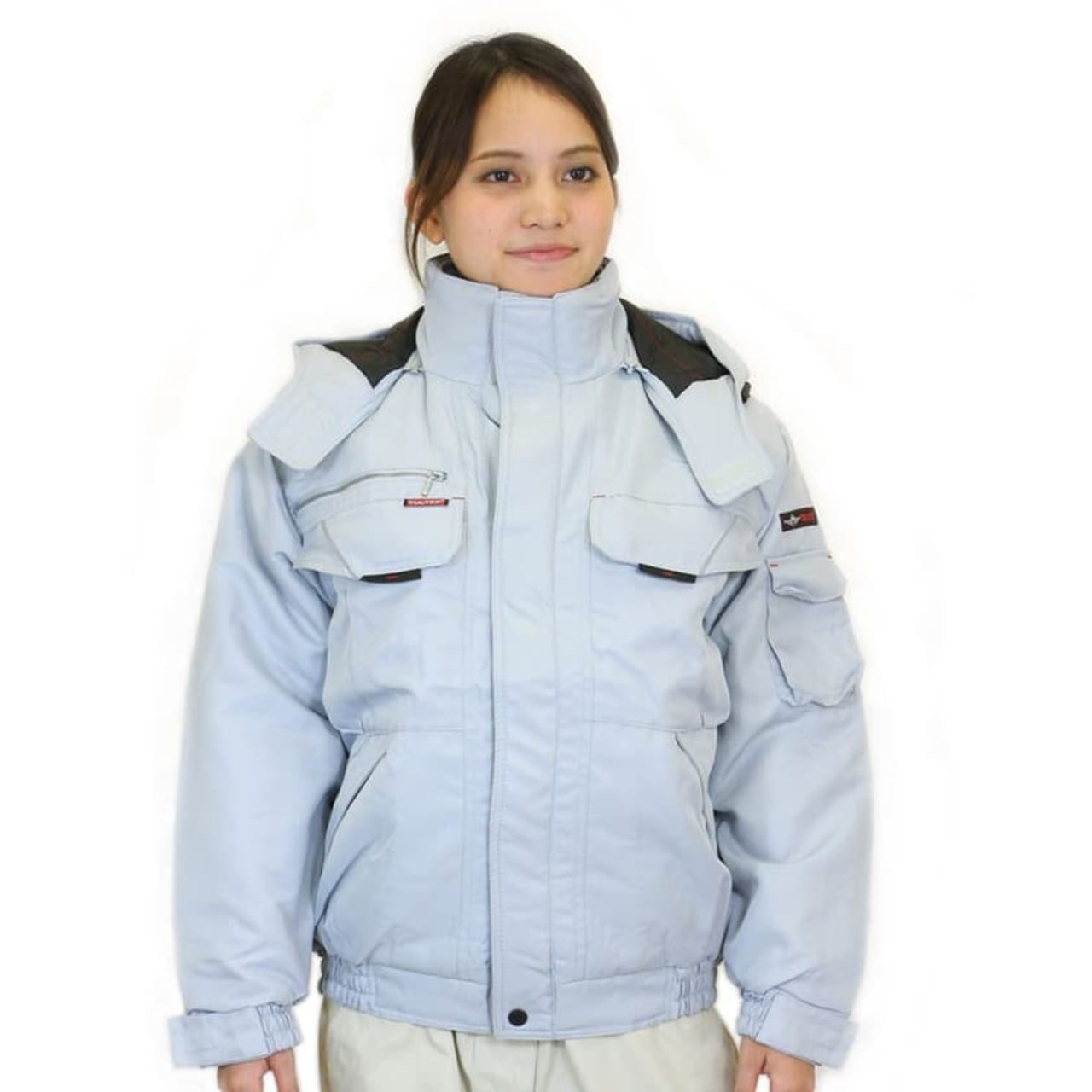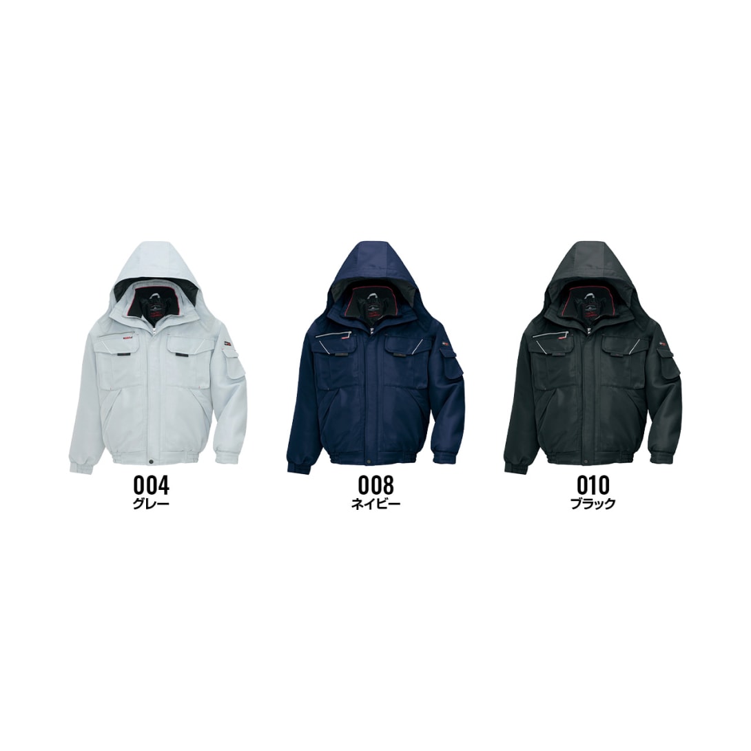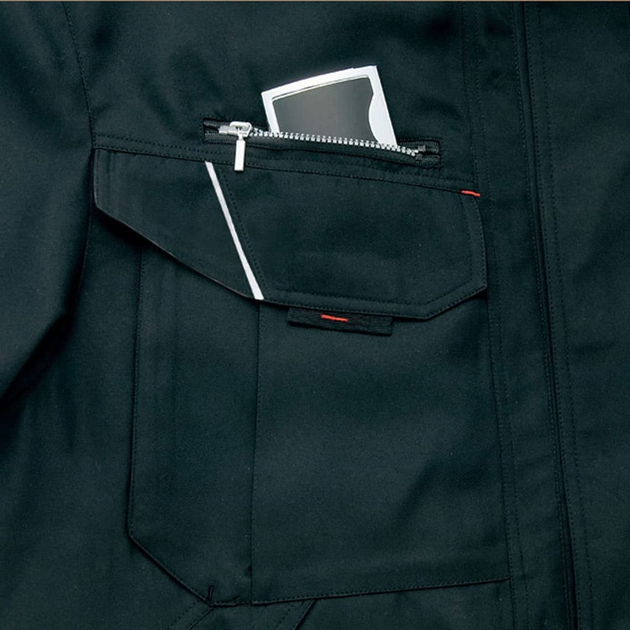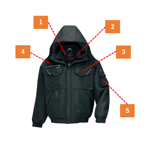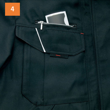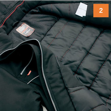 ウォーム感をアップする中綿入りボディ、首元からの風の侵入を防止するフルジップ仕様と寒い季節の作業をサポートする仕上がりが魅力です。フードは取り外しができるため、シーンに合わせて着用いただけます。胸元、腰、袖、内側へと豊富なポケットを備えており、必要な小物類をこのブルゾン1着で多く持ち運べるのも嬉しいポイント。反射パイピングなどの細やかな配慮にも注目です。