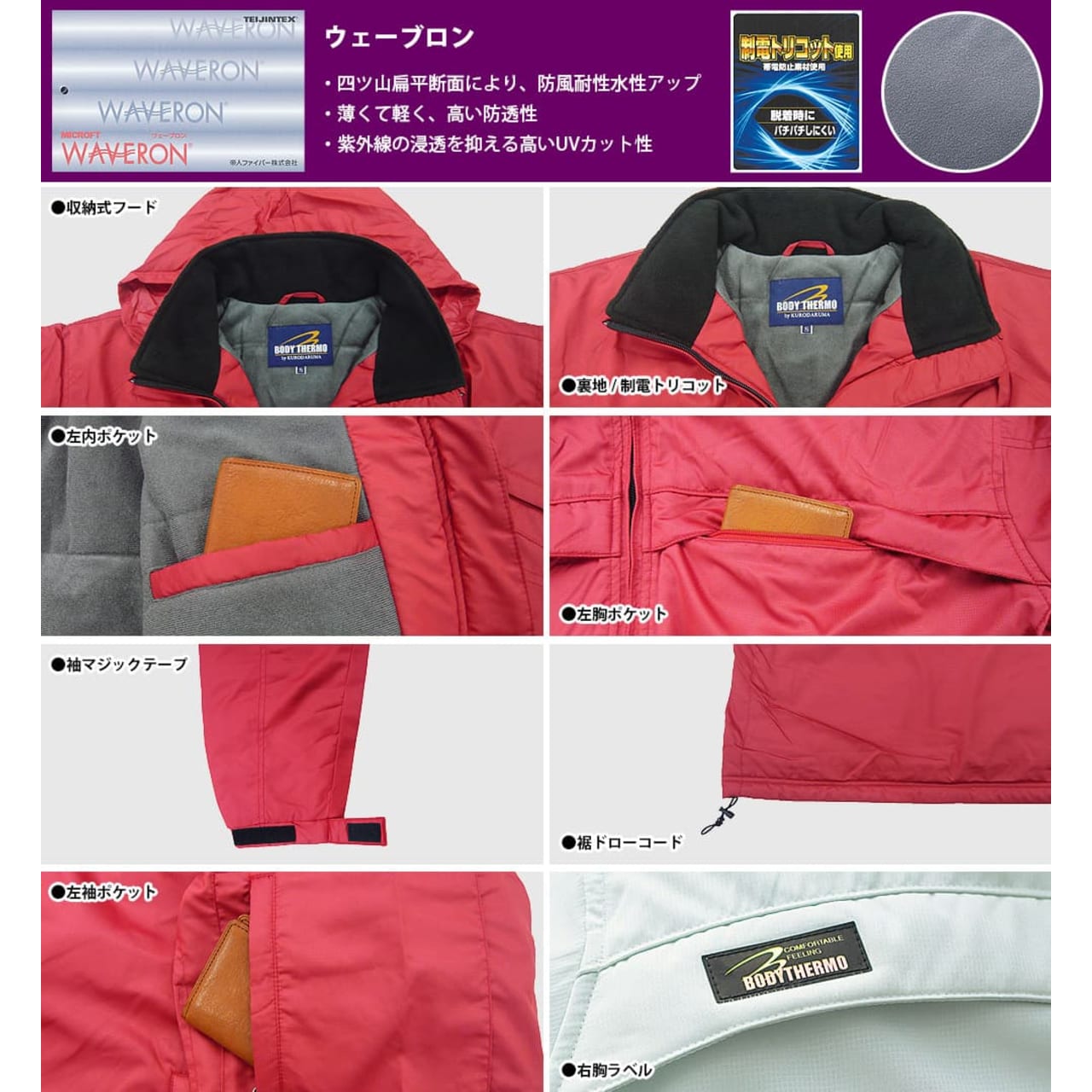 ウェーブロン採用でUVカット、防風・耐水性に優れたハーフコートです。素材はポリエステル100%を使用。だから、薄くて軽量で動きやすく、あまり負担を感じません。裏地には制電トリコットを採用。脱着時の不快なパチパチを防いで着替えを快適にしてくれます。フードは収納式なので、使わない時はコンパクトにまとめて保管しておけます。持ち運びも便利なので、現場の環境に合わせて自由に装着できるのがメリットです。合計4箇所にポケットと1箇所のペン差しで収納力もOK。カラーはブラック、ブルー、シルバー、レッドの4色。サイズはM〜5Lと幅広く用意されています。