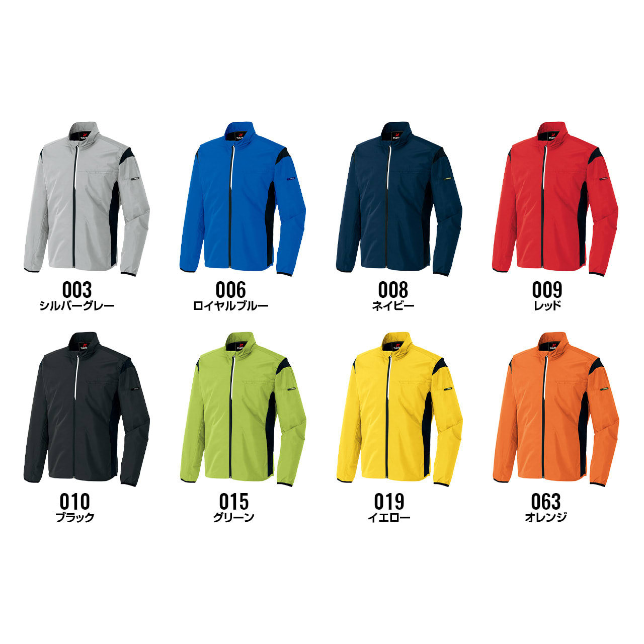 作業中の動きやすさに着目したアームアップジャケット。背中と肩、脇に施した伸縮性あるニットが機能して、スポーツウェアのような着心地を生み出しています。肩部分はアームアップ仕様に仕上げられており、腕の上げ下げがよりスムーズに。また、撥水加工により、ちょっとした雨や水を弾いて快適に作業できるよう、守ってくれます。防風加工も施されているので風のあたりを緩やかにしてくれるでしょう。カラーはブラック、シルバーグレー、ロイヤルブルー、ネイビー、グリーン、レッド、イエロー、オレンジの8色。サイズはSS〜6Lと幅広く用意されています。