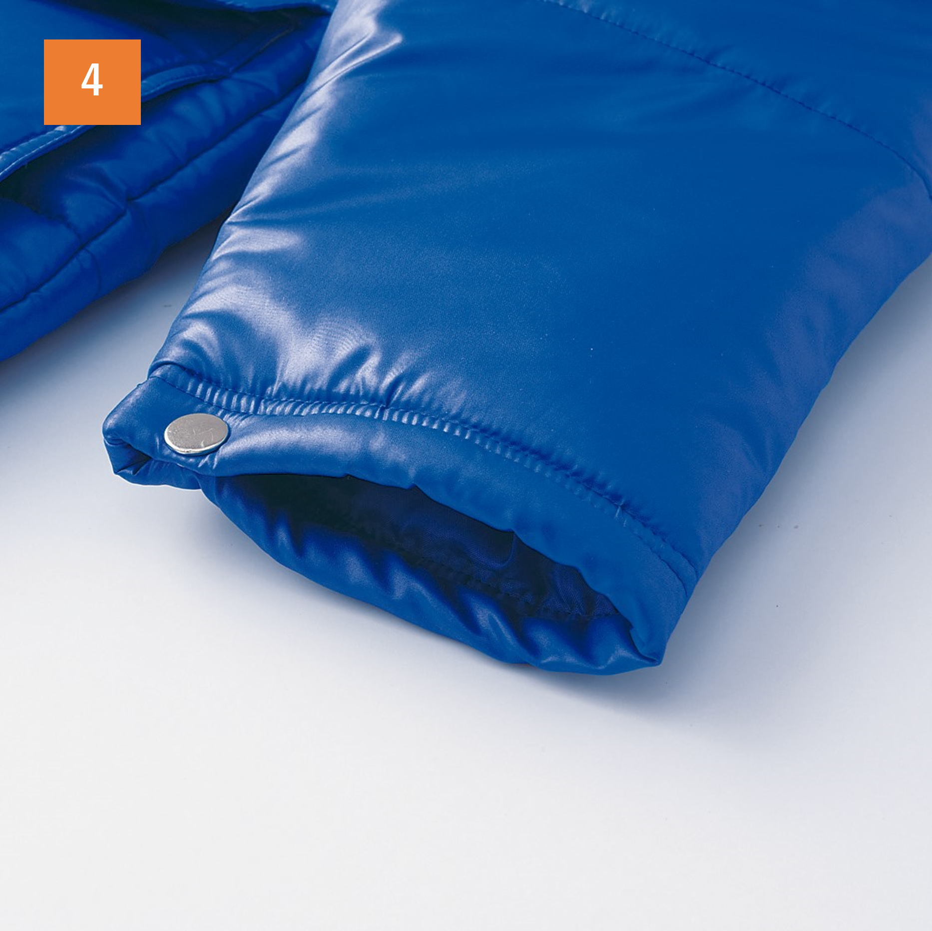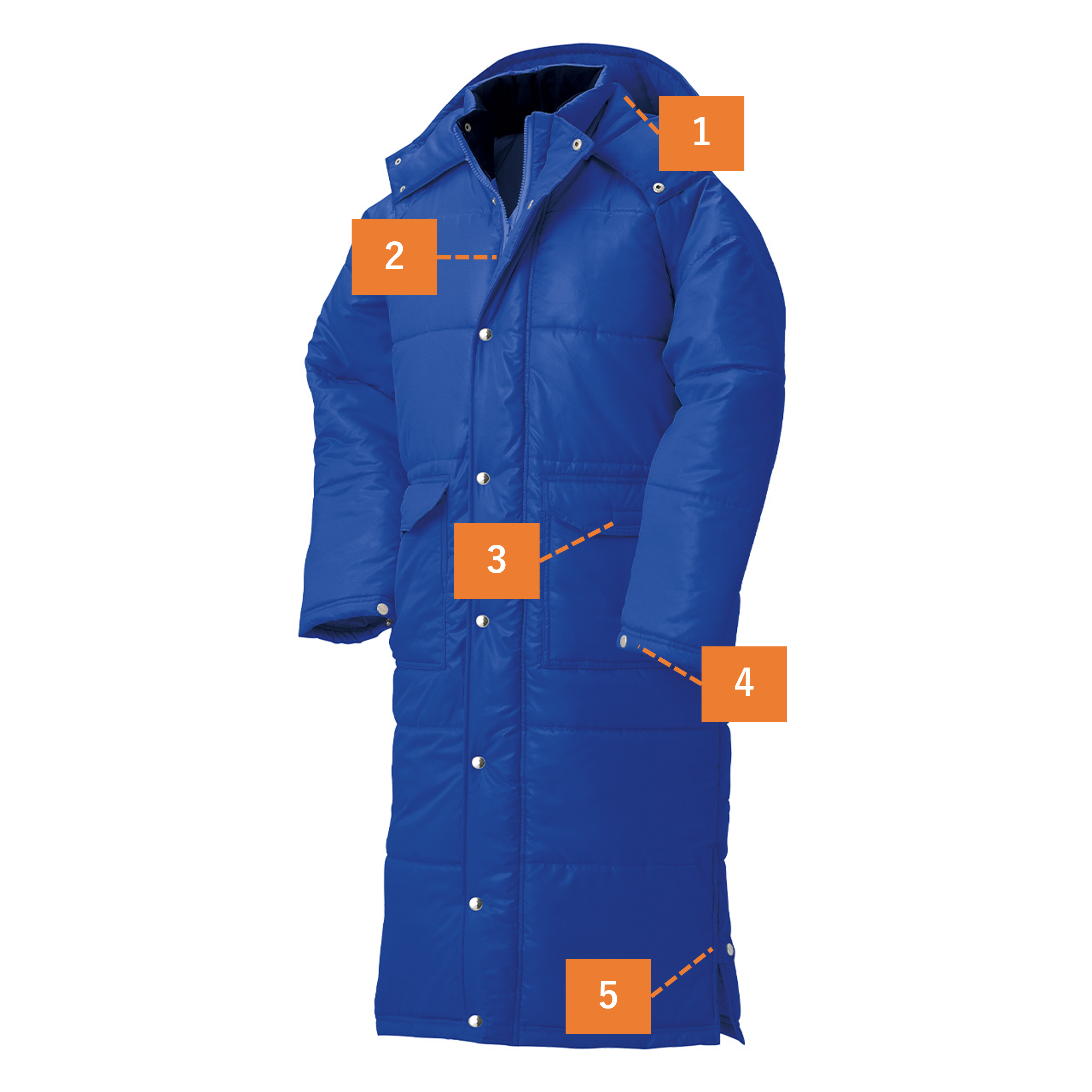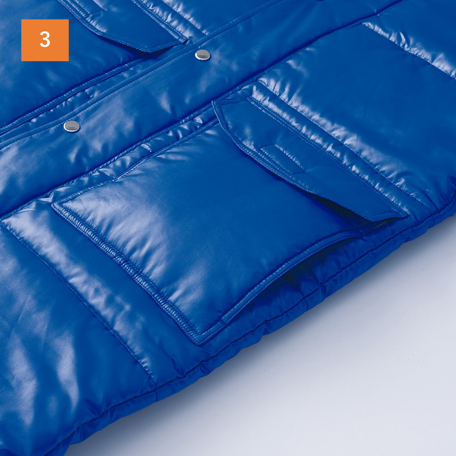 撥水性の高い表地に保温性の高い中綿を使用しています。 ハンドウォーマー付きのポケットや動きやすいスリット等、機能性も追求しました。