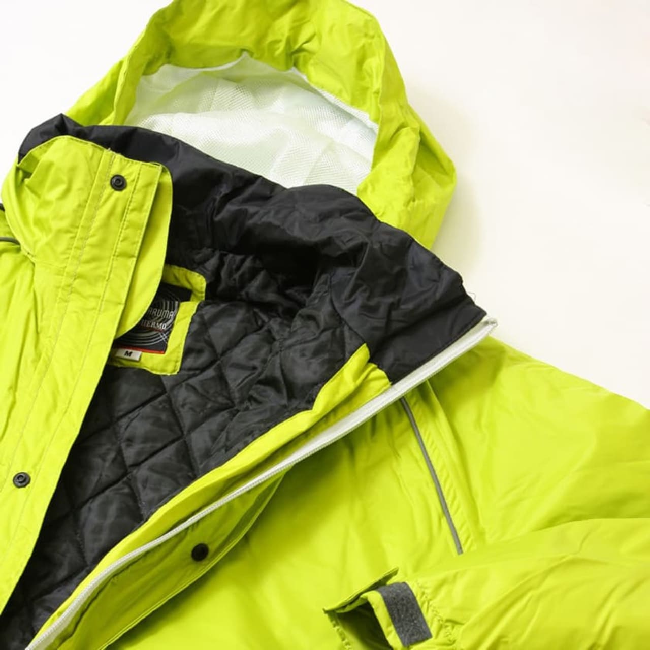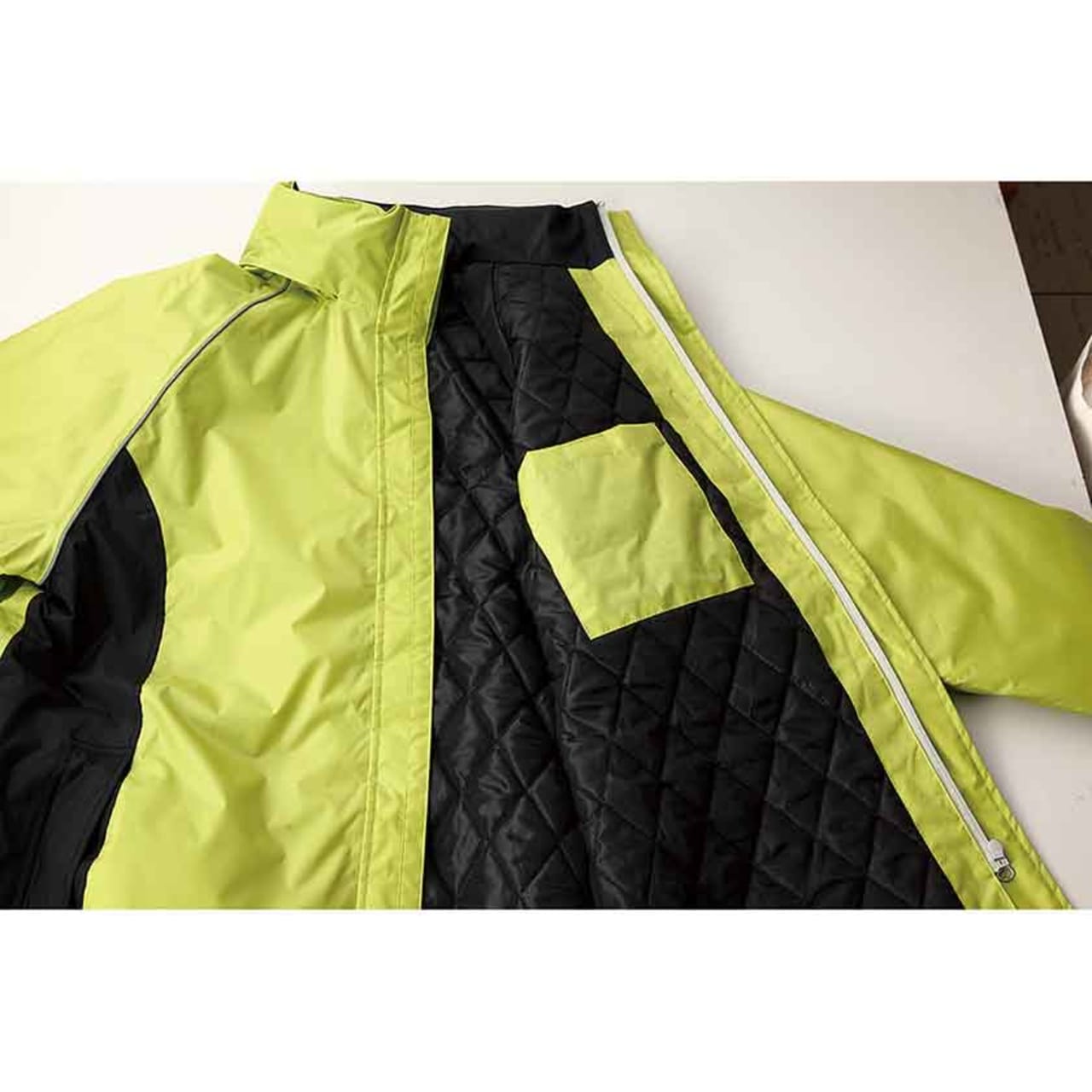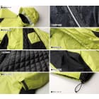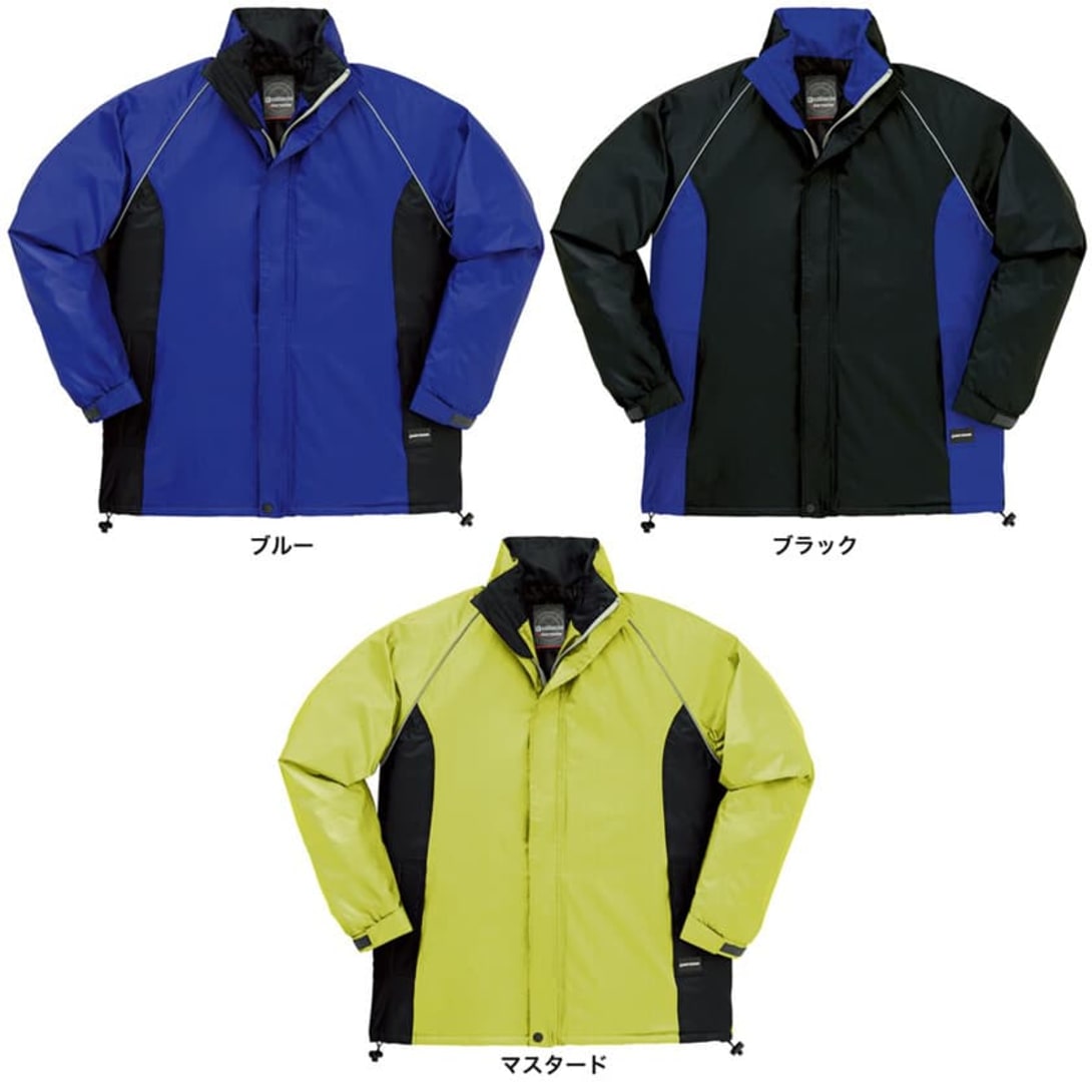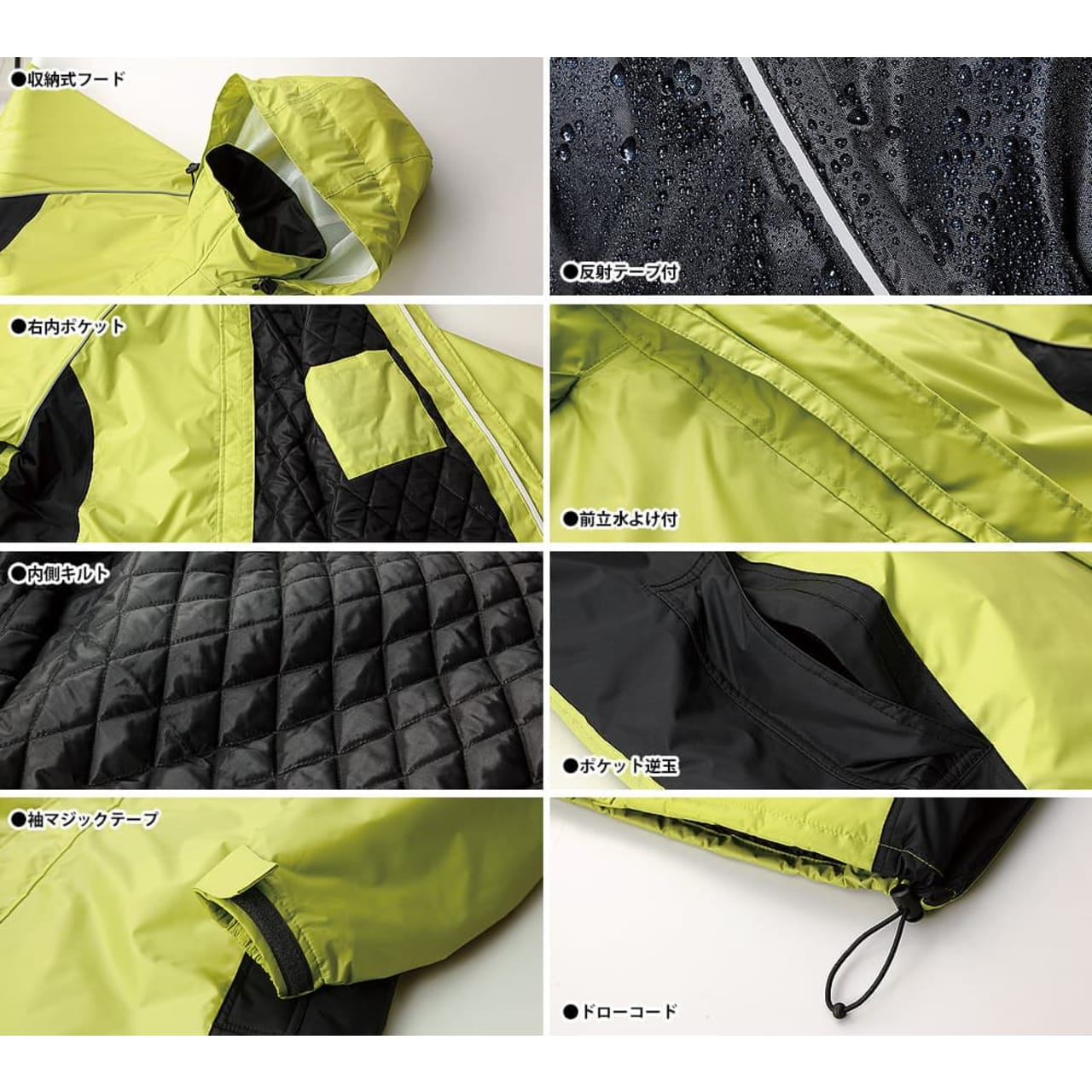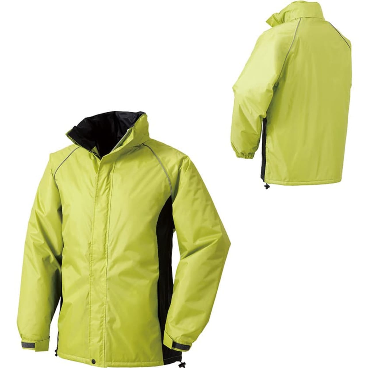 表地にPUコーティング、裏面にポリウレタンコーティングを施し防水撥水性を高めたコート。表地はPUコーティングにより、摩擦にも強い仕様になっています。さらに、リップストップを採用したことで摩擦による生地の裂けを防止して生地の劣化を防ぐ構造です。裏地は2枚の布の間に面を挟み込んでステッチで押さえたキルティング生地で、多少の保温性も期待できます。反射パイピング使いで安全面への配慮もバッチリ。前立て部分には水よけ付、袖はマジックテープ仕様、裾はドローコードで締められるので、多少の雨風ならよせつけません。カラーはマスタード、ブルー、ブラックの3色を展開。サイズはS〜7Lが用意されています。