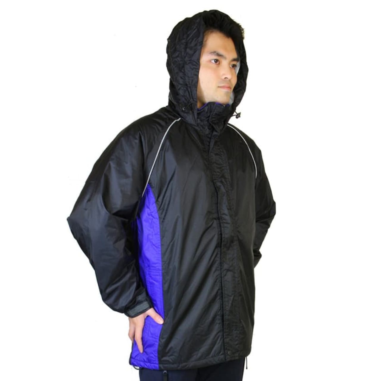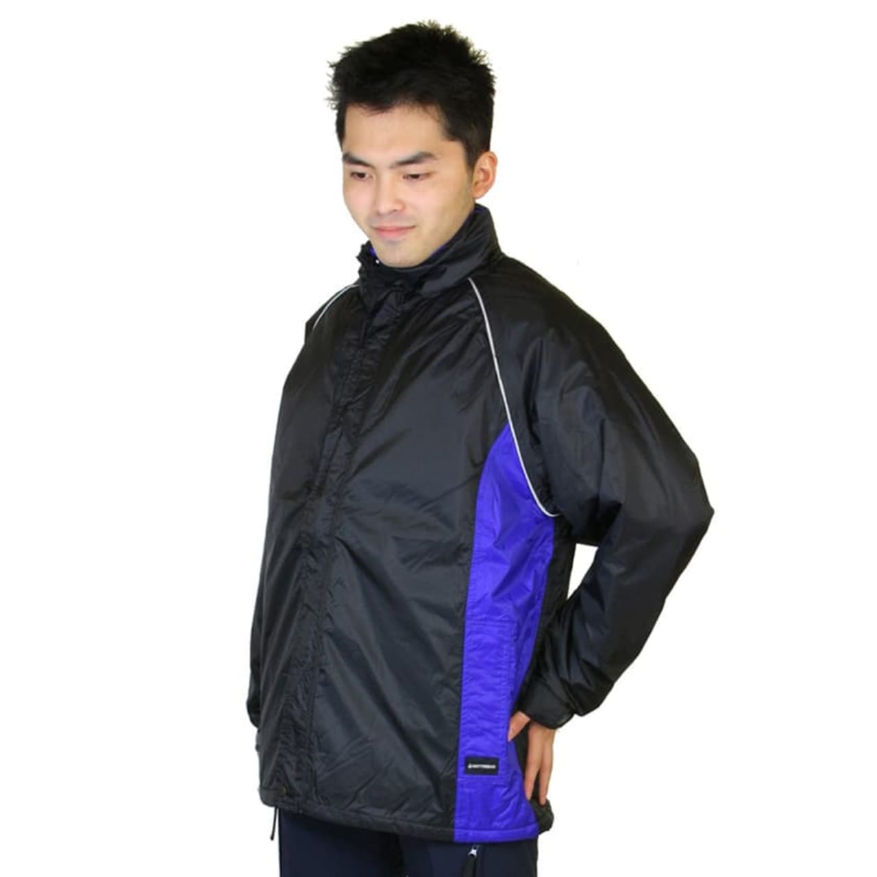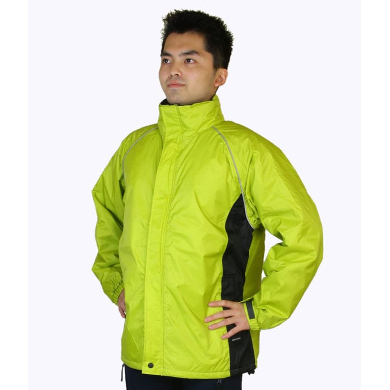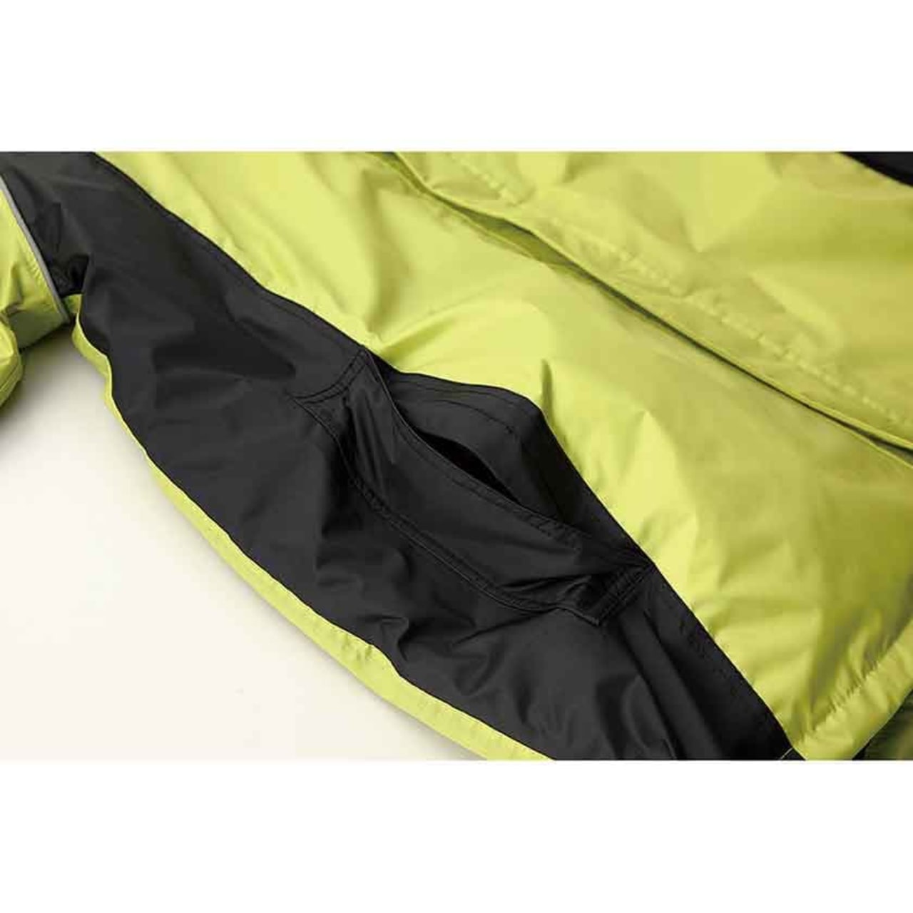 表地にPUコーティング、裏面にポリウレタンコーティングを施し防水撥水性を高めたコート。表地はPUコーティングにより、摩擦にも強い仕様になっています。さらに、リップストップを採用したことで摩擦による生地の裂けを防止して生地の劣化を防ぐ構造です。裏地は2枚の布の間に面を挟み込んでステッチで押さえたキルティング生地で、多少の保温性も期待できます。反射パイピング使いで安全面への配慮もバッチリ。前立て部分には水よけ付、袖はマジックテープ仕様、裾はドローコードで締められるので、多少の雨風ならよせつけません。カラーはマスタード、ブルー、ブラックの3色を展開。サイズはS〜7Lが用意されています。