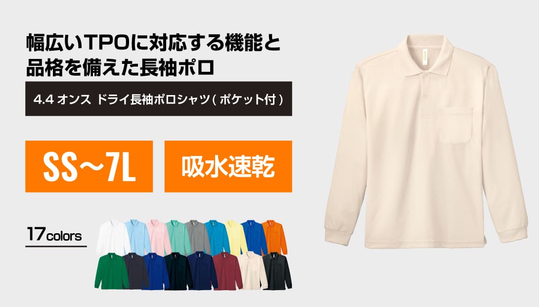 どこかフォーマルな印象を持ち、軽作業からビジネスシーンまで幅広く着用できるポロシャツです。注目はその着心地!吸汗性や速乾性に加えて、UVカット機能を備えることで、屋外での着用もアシストしてくれます。日焼け防止効果を示す紫外線保護指数はUPF20と、直射日光から肌をしっかりガード。また、刺繡やプリントなどを施してオリジナルウェアの制作も簡単に行えます。シルクプリント、転写、刺繡と多彩な表現が可能でとくに刺繍との相性がバツグンに良いです。