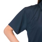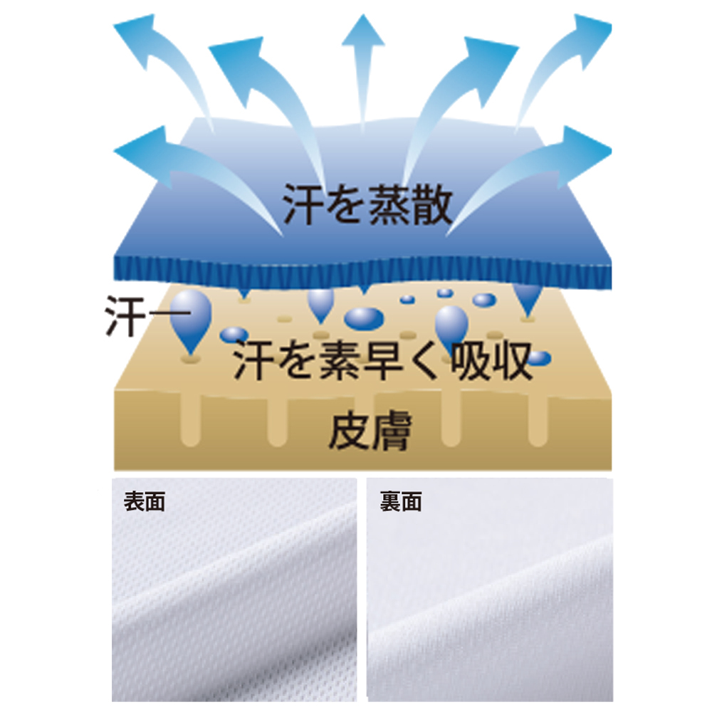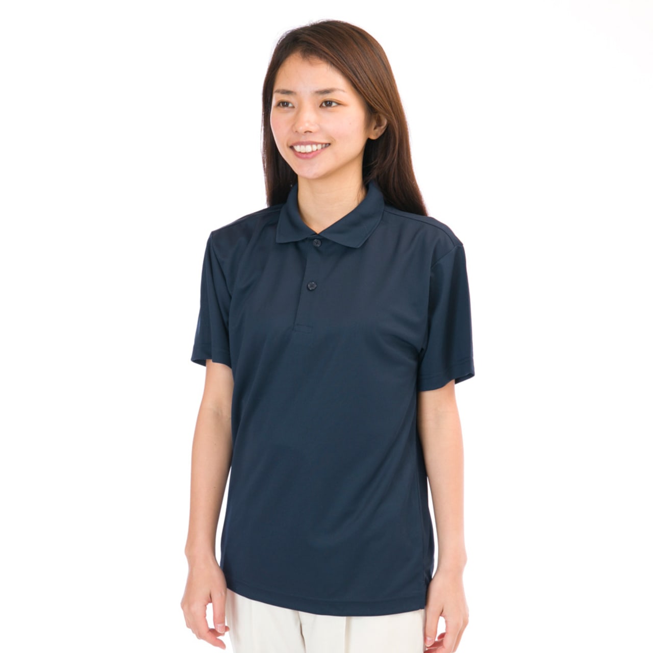 汗を吸収してすぐに乾き、UVカット機能も備えています。ポケット無しタイプで、ボタンは全体と同色を使用。
