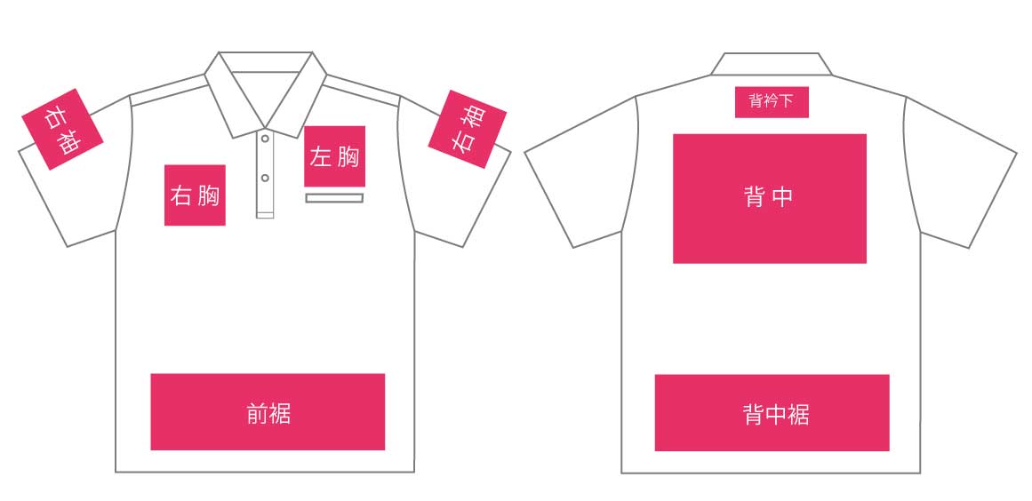 | 加工箇所例 | ポロシャツやシャツの胸・袖・背中衿下によくあるタイプ | 背中刺繍横長タイプ 文字2段等 |
