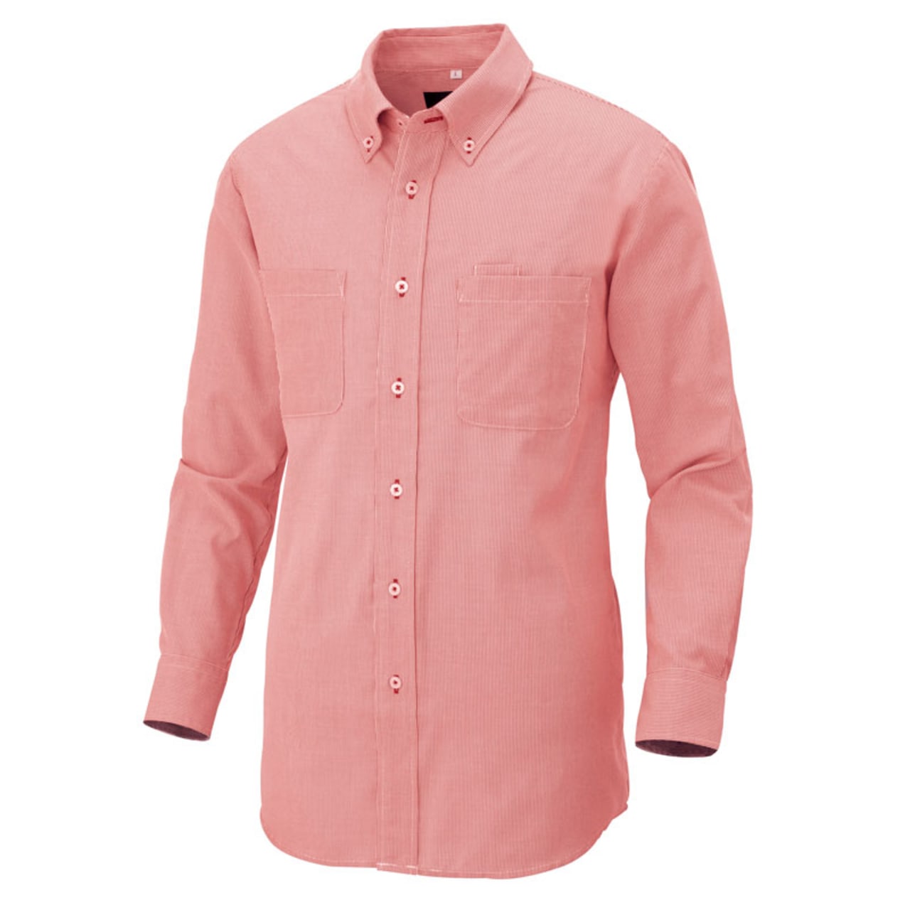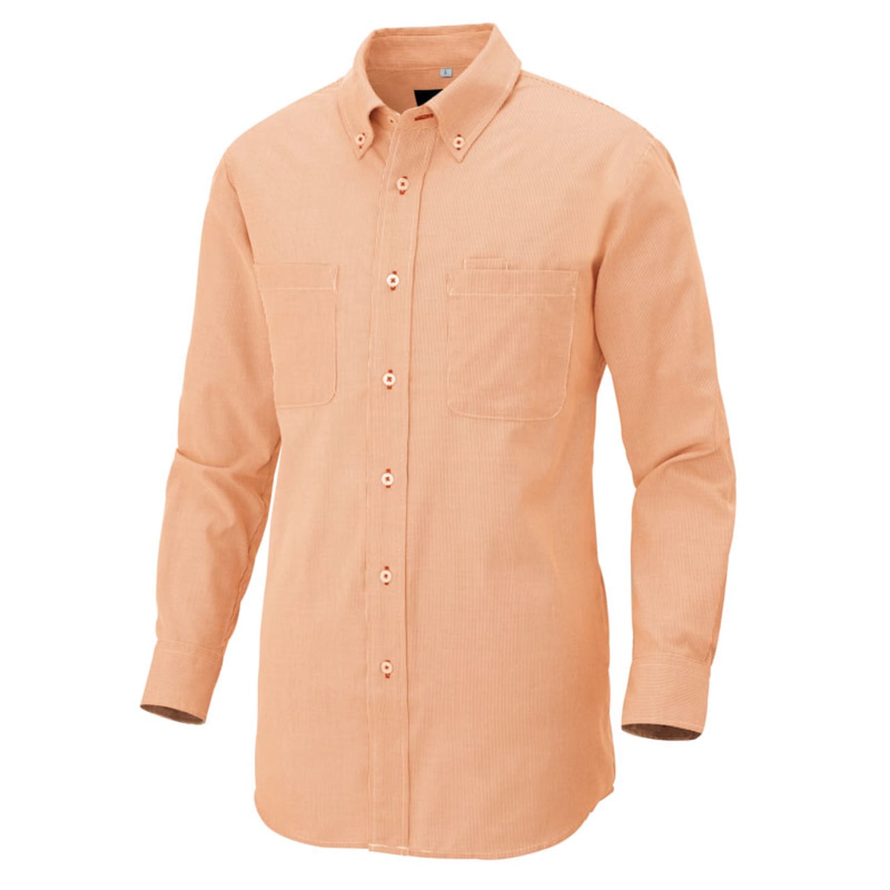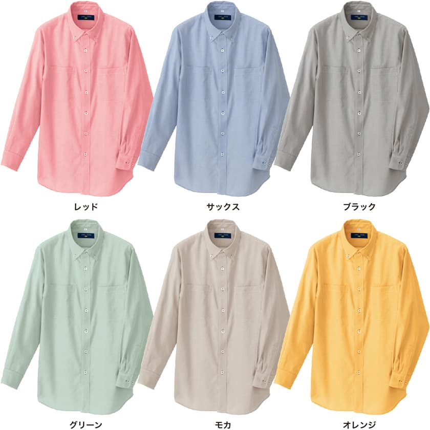 JIS T8118適合で帯電防止。左右胸ポケット付き。左胸ポケットの内側には、ペン差しやネームを挟めるループ付き。袖口はカフス2個付きで調整可能。襟元は形の崩れにくいボタンダウンのデザイン。裾はゆるやかに後ろが長く、背中が覗くのを軽減。ポリエステル80%、綿20%で耐久性◎。コードレーン生地で肌に密着しにくく、さらっと快適な着心地。幅広い3S〜5Lの9サイズ展開で体型を選ばず、男女兼用。カラーバリエーションはレッド、オレンジ、モカ、グリーン、サックス、ブラックの選べる6色展開。同素材の半袖の展開あり。