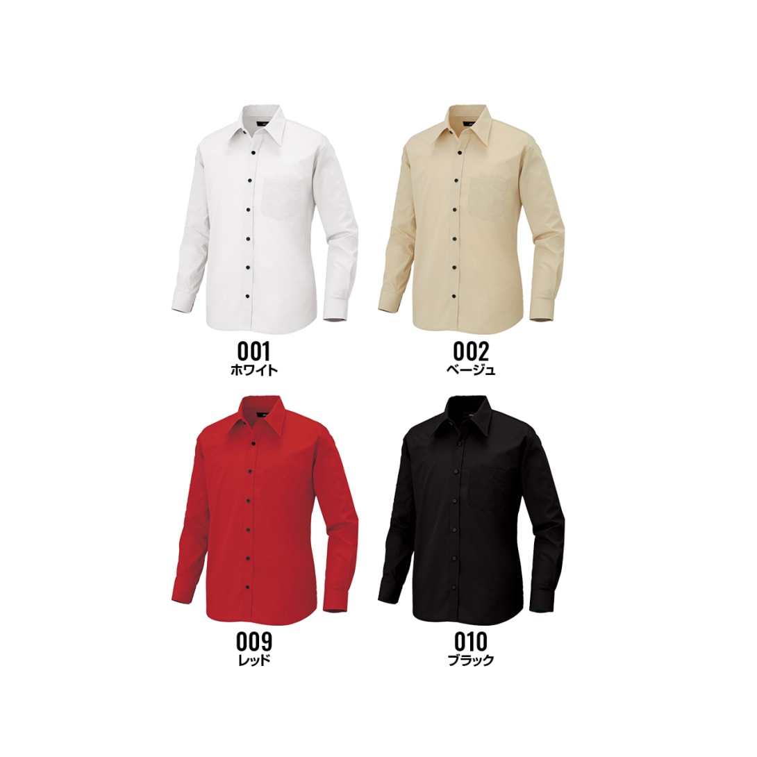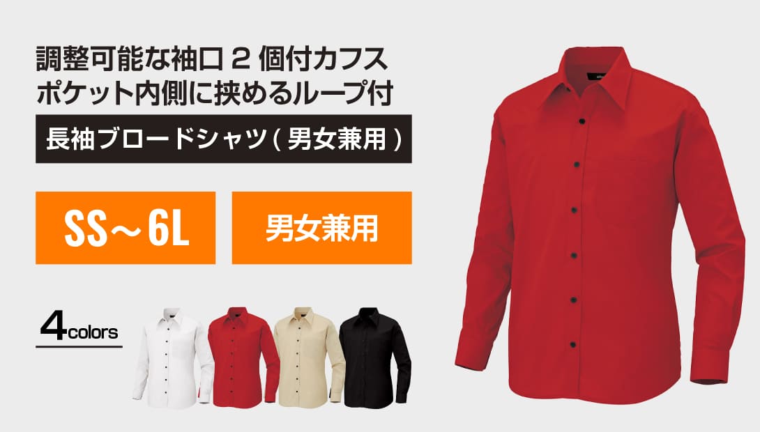 袖口はカフス2個付きで調整可能。左胸ポケットの内側には、ペン差しやネームを挟めるループ付き。平織りのブロード生地でさらっとしなやかな肌触り。ポリエステル65%、綿35%の黄金ブレンドで、シワになりにくくお手入れ簡単。吸水性、速乾性も良く汗をかいても快適な着心地。SS〜6Lの幅広い9サイズ展開で体型を選ばず、男女兼用。カラーバリエーションはホワイト、レッド、ベージュ、ブラックの4色。季節や用途に合わせて選べる同素材の半袖、七分袖の展開有。