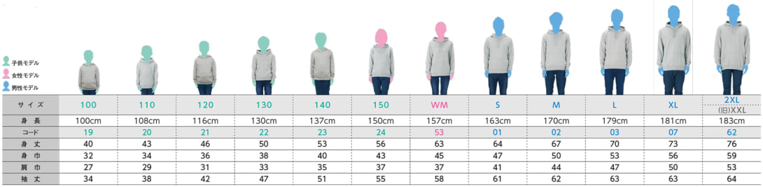 | サイズ | 100 | 110 | 120 | 130 | 140 | 150 | WM | S | M | L | XL | 2XL |