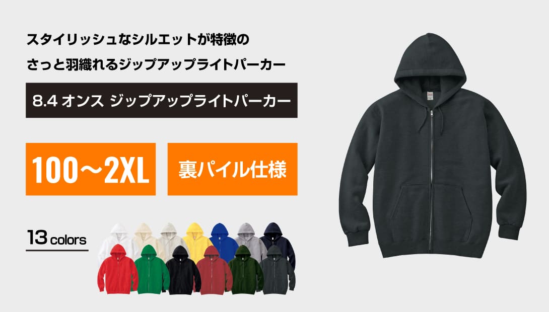 シンプルで、一枚あると何かと着回しやすいジップアップパーカーです。厚手すぎないので、夏場の冷房対策としてもおすすめの一着。綿100%生地ならではの着心地のよさも好評です。また、身頃とフード紐を同色にするなど、シンプルなデザインにも注目。刺繡やプリントのベースとしても優秀で、シルクプリント、転写、刺繡の3つの方法からお好みのテイストをお選びいただけます。特に刺繍加工が耐久性が強く、おススメです。カジュアルで使いやすいオリジナルのユニフォーム制作におすすめです。