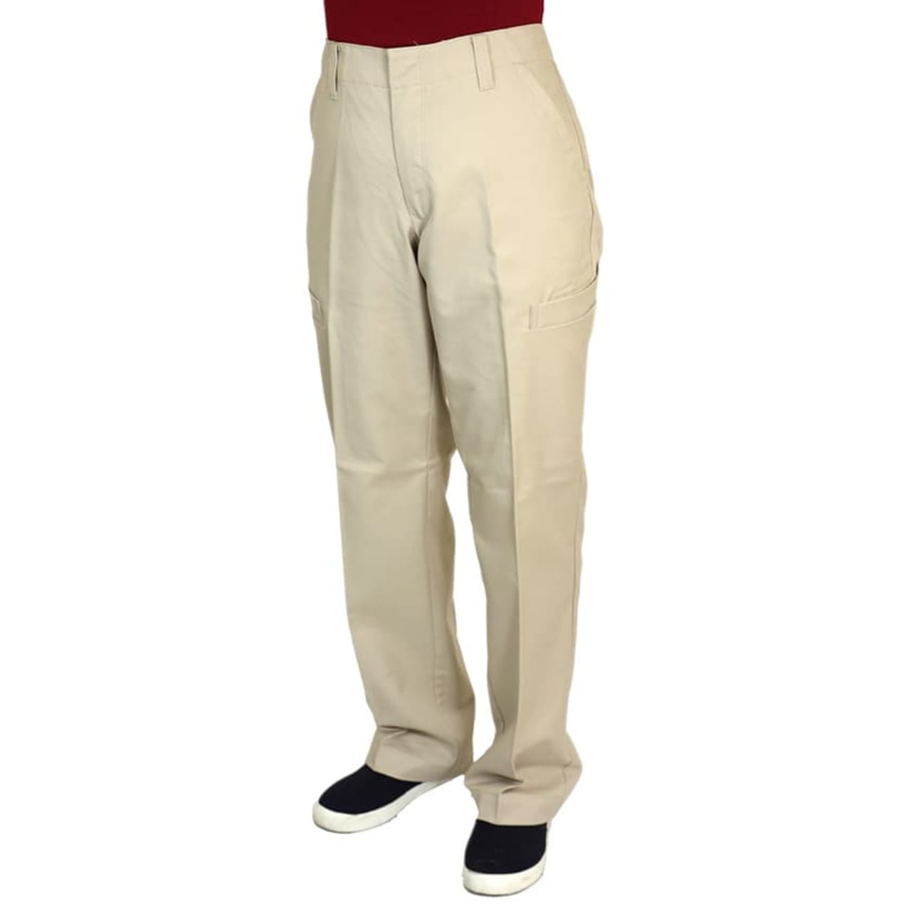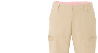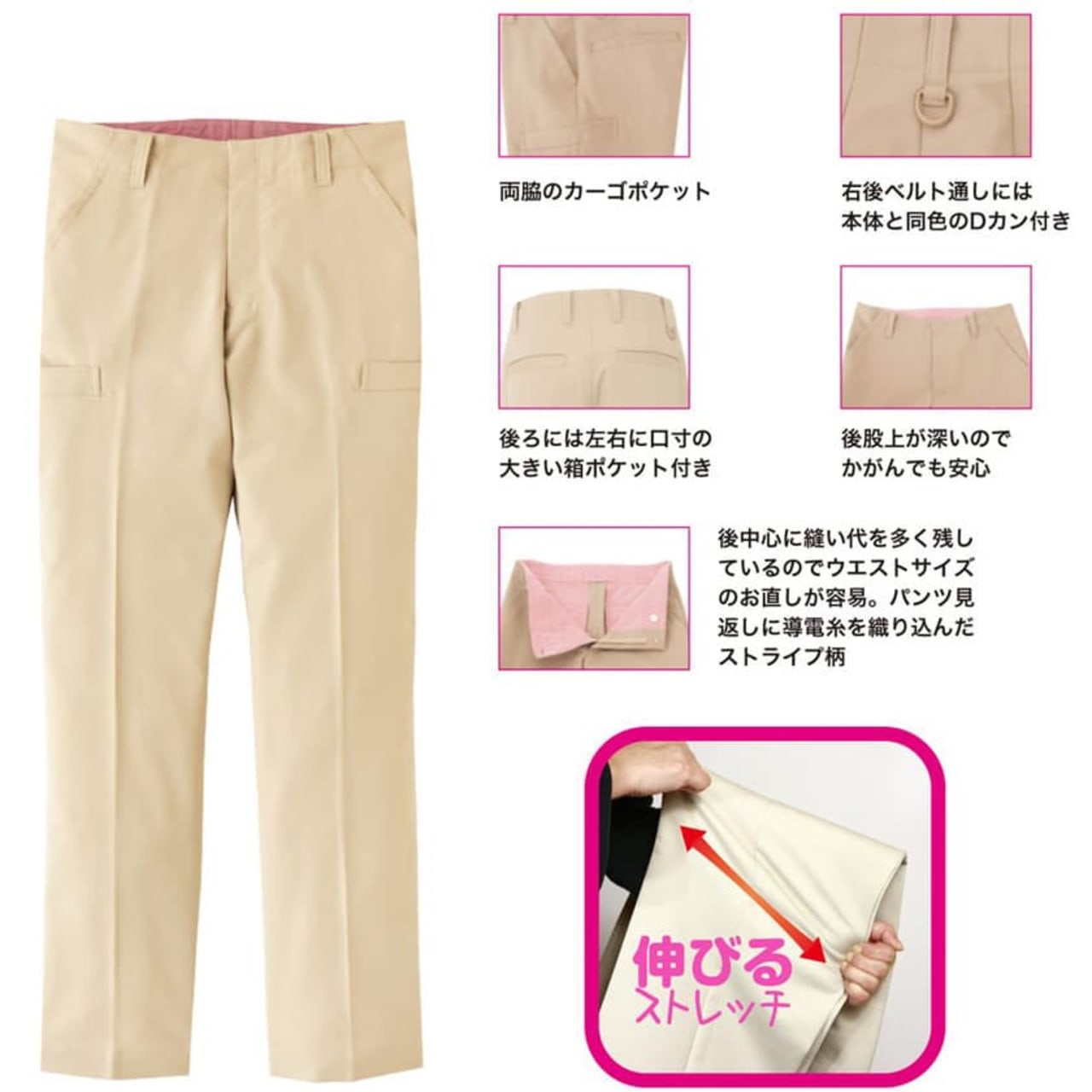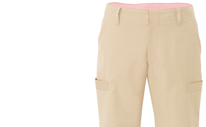 帯電防止で動きやすいストレッチ素材。脇にポケットがついたカーゴパンツですが、とてもスマートなデザインです。