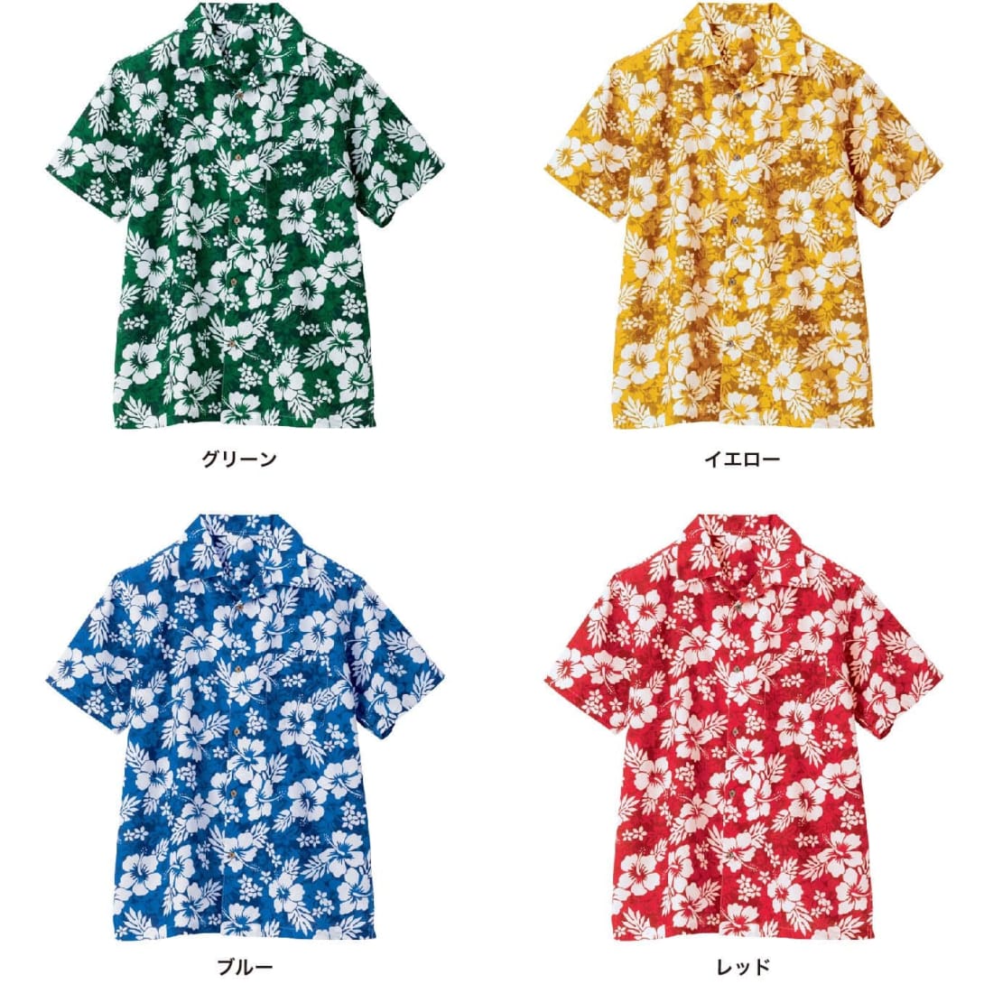 襟のデザインはオープンカラー(開襟)。左胸ポケット付き。ポリエステル65%、綿35%の黄金ブレンドで、シワになりにくくお手入れ簡単。吸水性、速乾性も良く汗をかいても快適。シーチングの平織り生地で通気性が高く快適な着心地。幅広い3S〜3Lの7サイズ展開で体型を選ばず、男女兼用。カラーバリエーションはレッド、イエロー、グリーン、ブルーの4色展開。