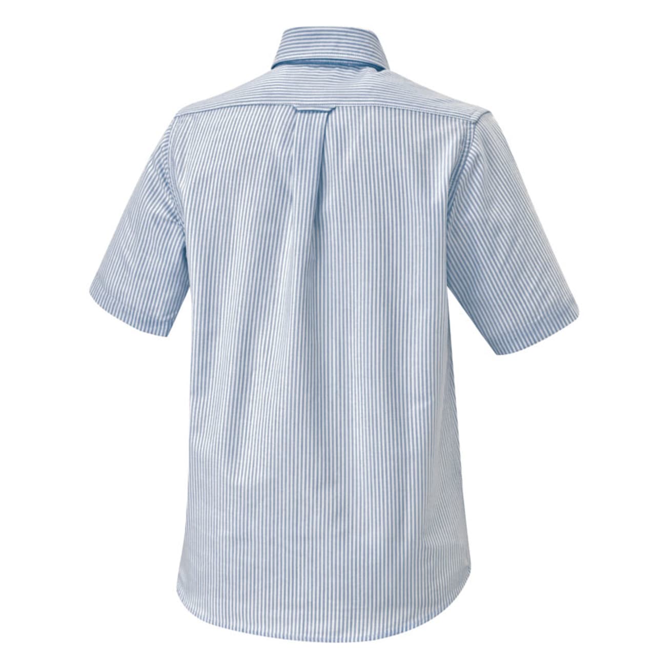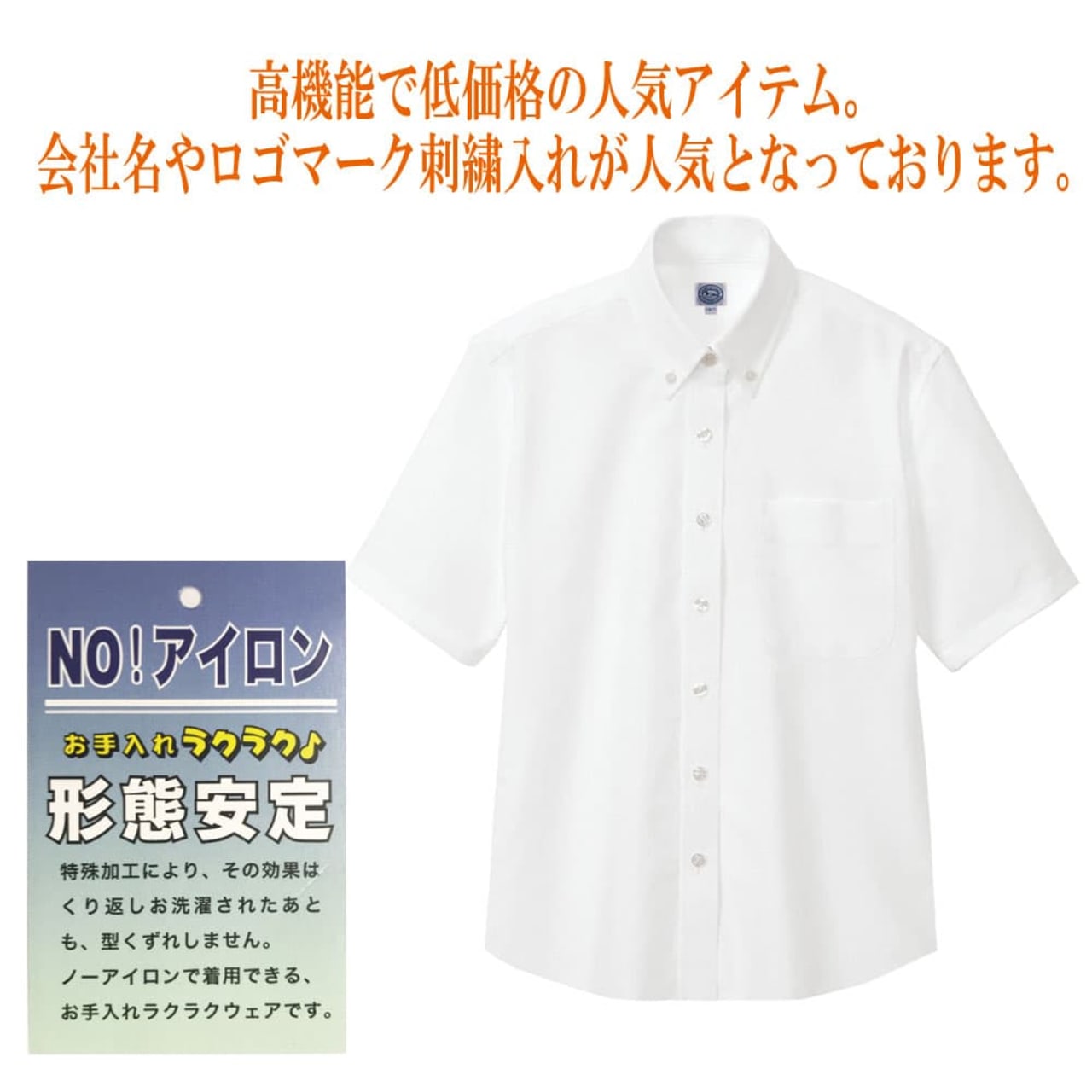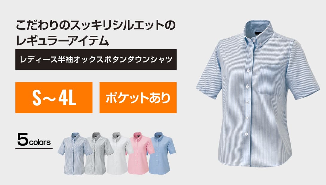 左胸ポケット付き。襟元は形の崩れにくいボタンダウンのデザイン。オックスフォード素材で通気性が良く、しなやかな肌触り。ポリエステル65%、綿35%の黄金ブレンドで、シワになりにくくお手入れ簡単。吸水性、速乾性も良く汗をかいても快適な着心地。体型を選ばないS〜4Lの幅広い6サイズ展開。カラーバリエーションは無地のホワイト、ピンク、サックスの3色と、ストライプのサックスストライプ、グレーストライプの2色の計5色展開。同素材の長袖の展開あり。