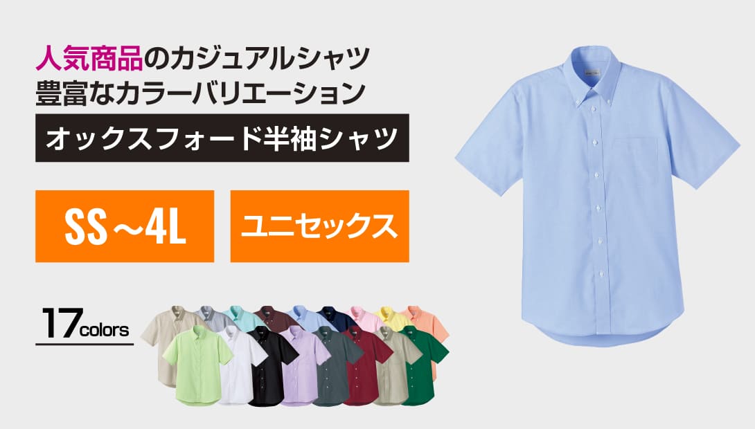 左胸ポケット付き。襟元は形の崩れにくいボタンダウンのデザイン。世界トップレベルの安全な繊維製品であることに加え、STeP認証された工場で生産された証である「エコテックス®メイドイングリーン」を取得で有害物質の心配なく環境等にも配慮されているから安心して着用いただけます。オックスフォード素材で通気性が良く、しなやかな肌触り。ポリエステル65%、綿35%の黄金ブレンドで、シワになりにくくお手入れ簡単。吸水性、速乾性も良く汗をかいても快適な着心地。豊富な17色展開。体型を選ばないSS〜4Lの幅広い7サイズ展開で男女兼用。同素材長袖、七分袖の展開あり。