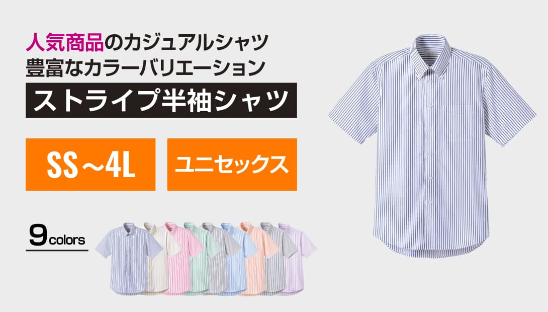 左胸ポケット付き。襟元は形の崩れにくいボタンダウンのデザイン。世界トップレベルの安全な繊維製品であることに加え、STeP認証された工場で生産された証である「エコテックス®メイドイングリーン」を取得で有害物質の心配なく環境等にも配慮されているから安心して着用いただけます。オックスフォード素材で通気性が良く、しなやかな肌触り。ポリエステル65%、綿35%の黄金ブレンドで、シワになりにくくお手入れ簡単。吸水性、速乾性も良く汗をかいても快適な着心地。柔らかで明るいストライプの9色展開。体型を選ばないSS〜4Lの幅広い7サイズ展開で男女兼用。同素材の長袖の展開あり。