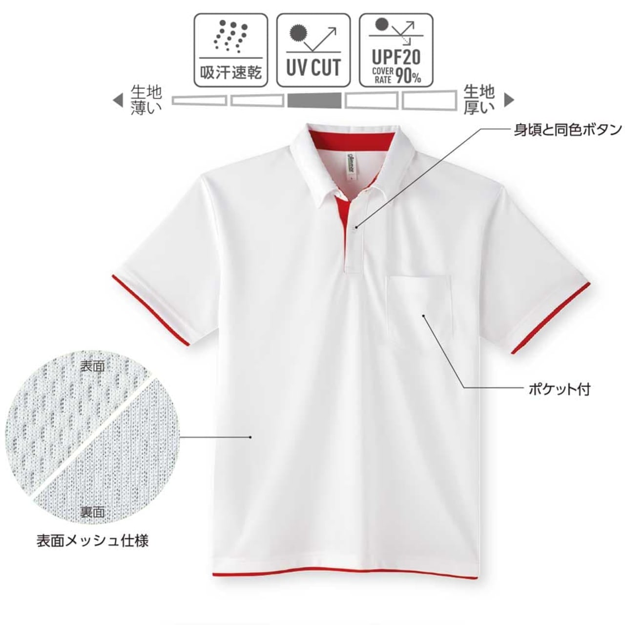 厚みのあるドライ素材の生地を使用して、UVカット、UPF20 紫外線遮蔽率90%と、汗や紫外線が気になる季節におすすめです。