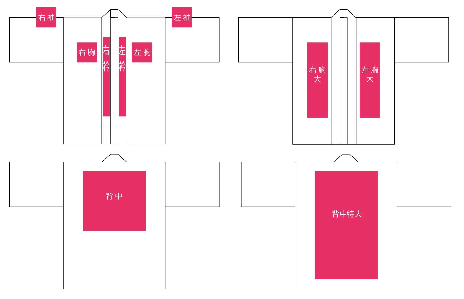 | 加工サイズ | 両衿 | 背中(小)/横25×縦25cm以内 | 背中(中)/横35×縦30cm以内 | 背中(大)/横35×縦40cm以内 | 両衿+背中(小) |