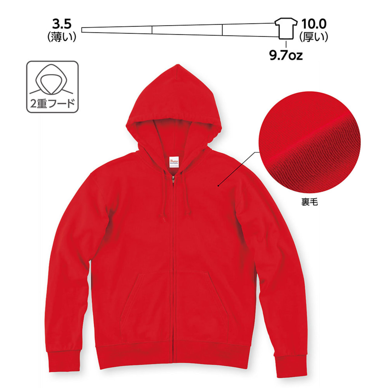 細部までこだわったベーシックジップパーカです。フードサイズはやや大きめで、被った時にも美しいシルエットをキープ。フードは2重フード仕様になっており、ふっくらとボリュームのあるシルエットに。360°どこから見てもかっこいい、おしゃれなスタイルを作ってくれる一着です。シルクプリント、転写、刺繡の3つの加工に対応しており、オリジナルユニフォームの制作にも最適。特に耐久性にすぐれている刺繍加工がおススメです。カジュアルなスタッフユニフォームやチームウェアなど、幅広い用途にお使いいただけます。